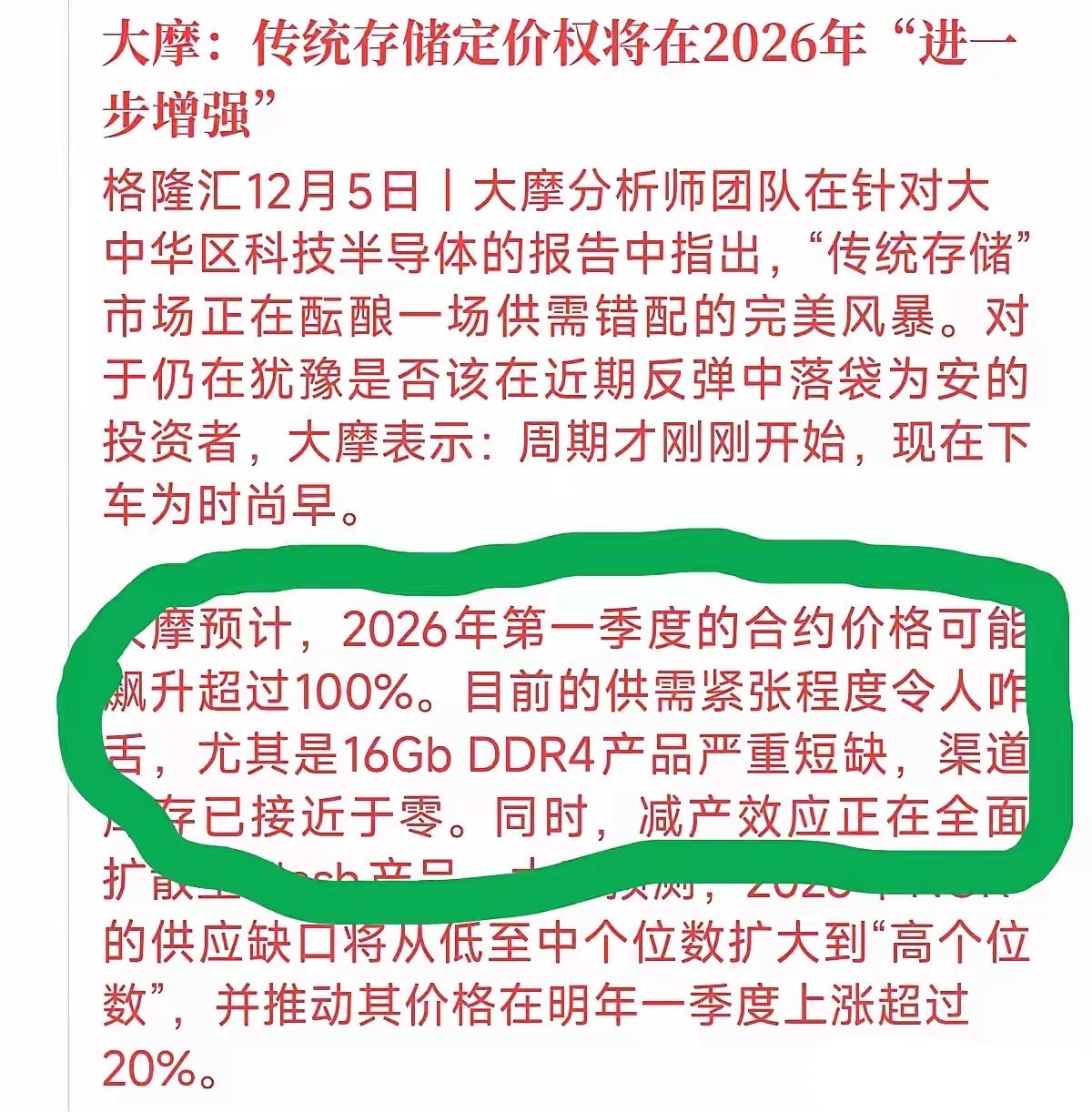 大摩最新研报:存储芯片再涨超100%,就在2026年的一季度!更猛烈的涨价风暴即将到来近几周,存储芯片市场价格与存储芯片股盘表现很错位,存储芯片的股市表现让人忍无可忍,每天都在调整,似乎调整结束遥遥无期,其实一切还算凑合吧,你看存储芯片三剑客江德香已经企稳,不再创新低了。本周存储芯片市场价格延续上涨势头,核心品类涨幅明确,涨价趋势未出现任何放缓迹象。内存(DRAM)供应紧缺程度远超预期,供需缺口下持续提价,DDR5涨势最猛。大摩最新研报:周期才刚刚开始,现在下车还为时过早。并进一步指出,“2026年第一季度合约价格可能飙升超过100%!”16Gb DDR4渠道库存接近为零……市场是最诚实的,物以稀为贵,存储芯片的市场价格飙升,早晚会体现在股票市场上,现在持有存储芯片概念股的投资者,可能输的只是时间而已!