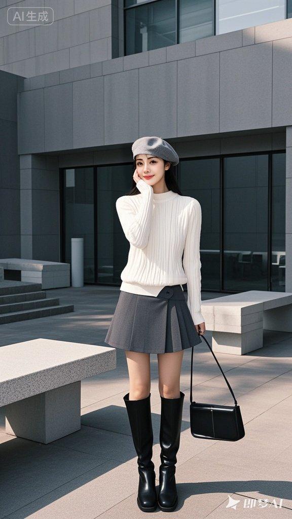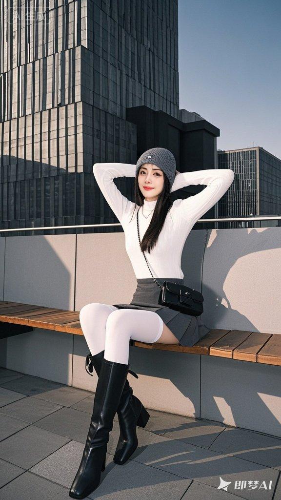 女子妆容精致,淡红唇亮眼,眼妆清透,长发乌黑披肩;身着白色毛绒外套,内搭黑色衣物