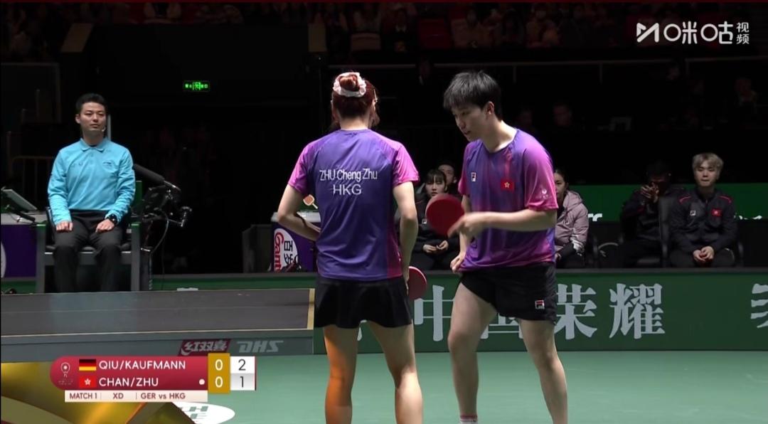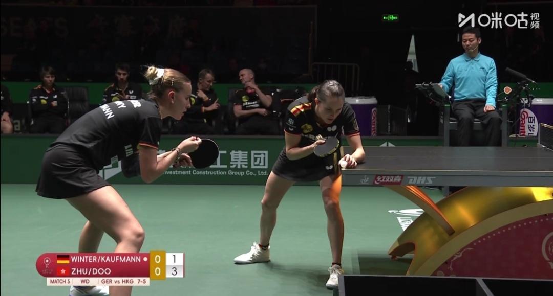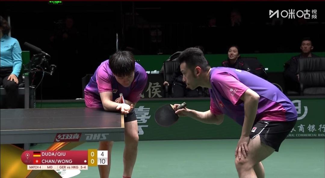 德国队8:5胜中国香港 第二阶段循环赛最后一轮比赛(第六轮) 德国队8:5中国香港队 第一盘混合双打 邱党/考夫曼2:1(11-9;11-3;11-13)胜中国香港陈颢桦/朱成竹。 第二盘女单 温特2:1(13-11;11-8;8-11)胜中国香港杜凯琹。 第三盘男单 杜达1:2(11-4;8-11;8-11)负中国香港黄镇廷。 第四盘男双 邱党/杜达2:1(4-11:11-2;11-7)逆转胜中国香港黄镇廷/陈颢桦。 第五盘女双 温特/考夫曼1:0(11-8)胜中国香港/杜凯琹/朱成竹。 中国香港无缘晋级了。
