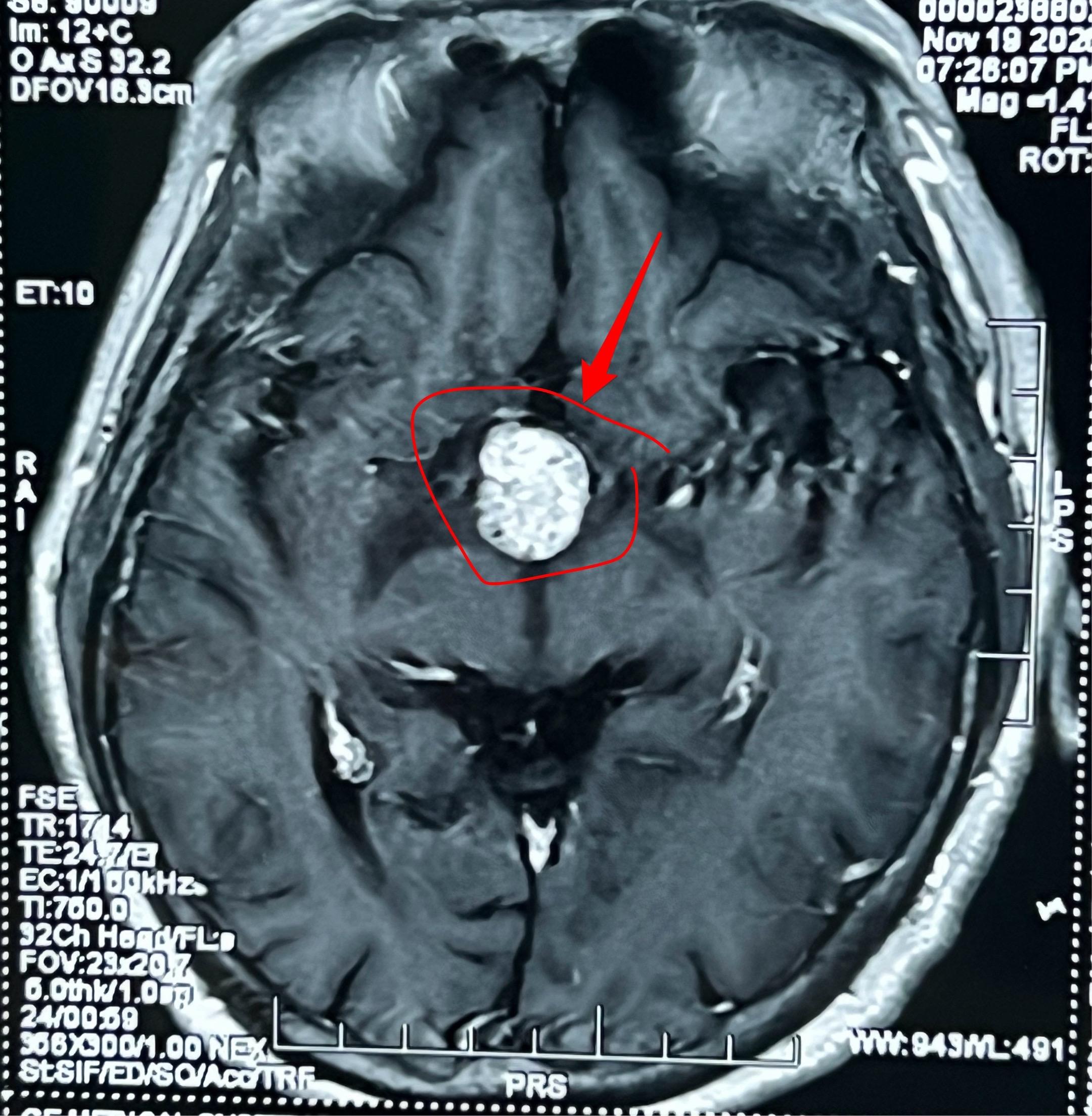颅底脑膜瘤,彻底切除是首选治疗。59岁男性,体检发现这个肿瘤,无头痛症...