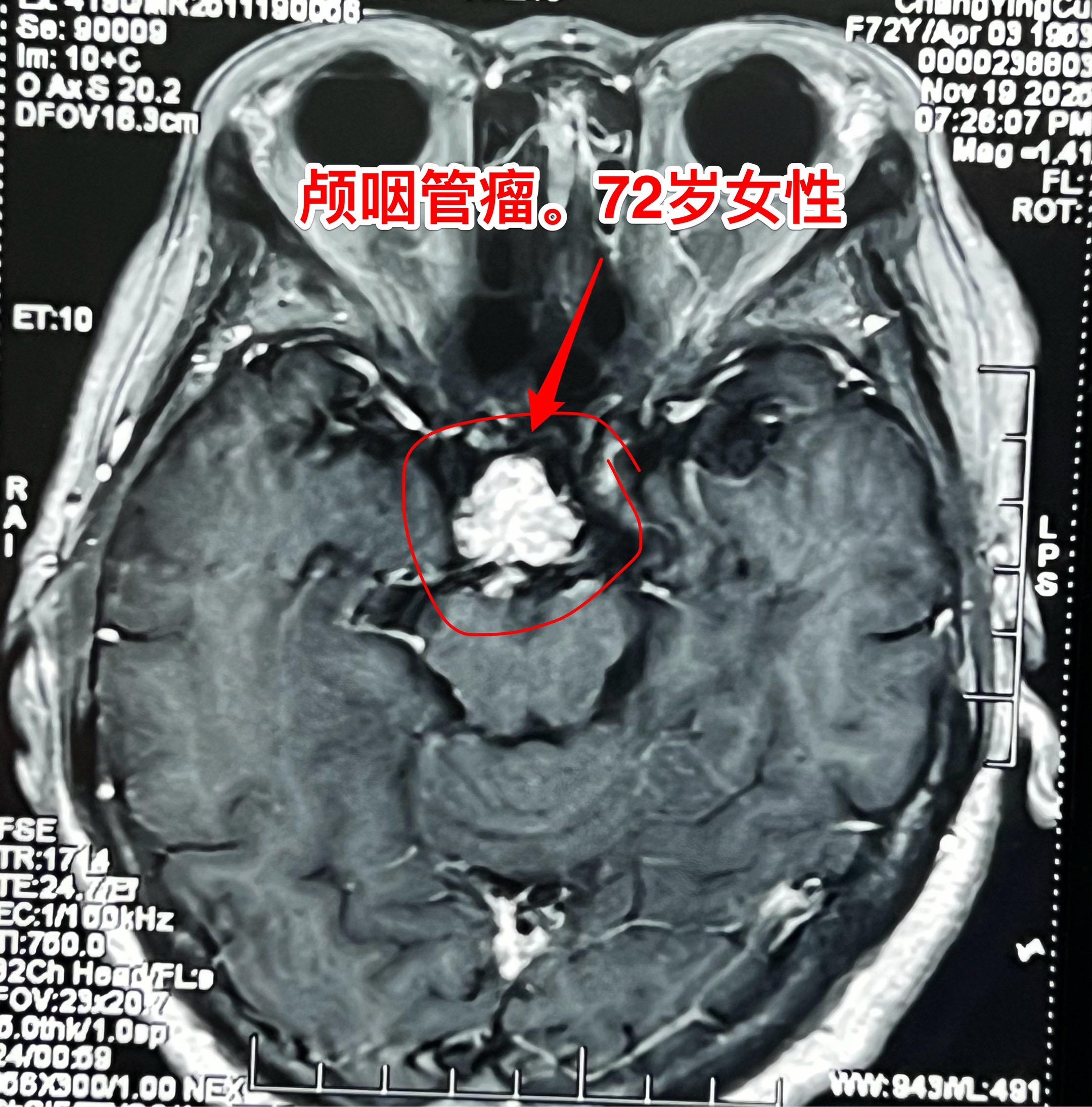 颅咽管瘤可以在任何年龄发病。72岁老人也患颅咽管瘤! 很多人都认为颅咽管瘤是小孩子得的病,其实不然。 70岁以上的老人也会患上颅咽管瘤这种病。这个72岁的青海省女性,因为视力下降、头痛到医院检查,发现了这个颅咽管瘤。 12月5日在我科行开颅手术将肿瘤完全切除。(今年我科的第193个颅咽管瘤手术。
