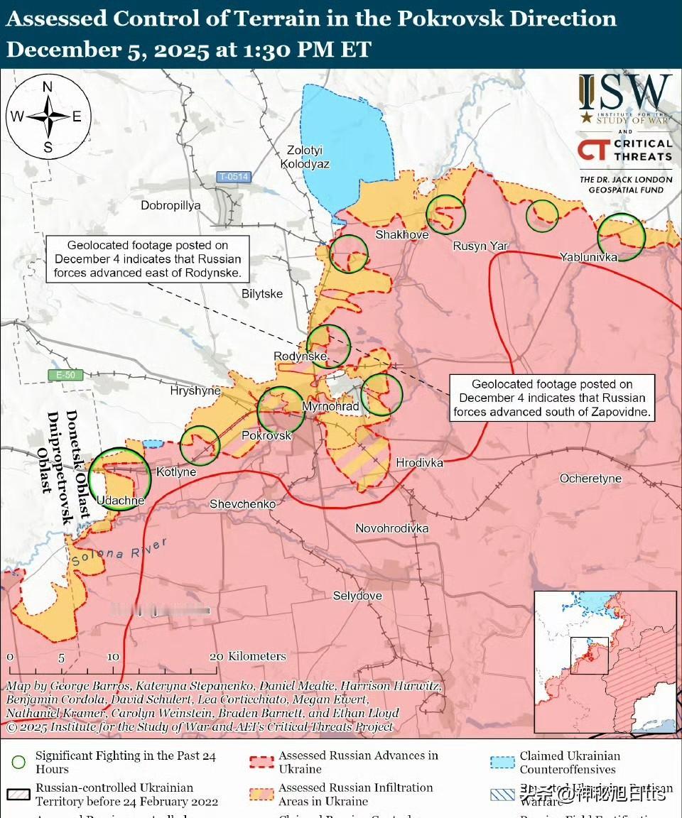 公开信息显示截至 12 月 5 日,俄军尚未包围米尔诺赫拉德的乌克兰军队,俄军仍在努力完成对波克罗夫斯克-米尔诺赫拉德包围圈的包围。 12月4日公布的地理定位视频显示,俄军近期向米尔诺赫拉德(波克罗夫斯克以东)北部和东南部推进。12月4日公布的其他地理定位视频还显示,俄军已渗透到波克罗夫斯克西北部的阵地。然而,这些地理定位信息尚不足以断定俄军已在波克罗夫斯克-米尔诺赫拉德包围圈内完全包围乌克兰军队。乌克兰空降突击部队第7快速反应军司令叶夫根·拉西丘克准将于12月5日报告称,俄军尚未包围波克罗夫斯克-米尔诺赫拉德,乌克兰军队控制着波克罗夫斯克北部,并在波克罗夫斯克中部保持阵地。拉西丘克指出,俄军正在避免城市巷战,而是试图从波克罗夫斯克侧翼绕过该城。ISW继续评估认为,俄军很可能完成包围。经过 21 个月的战役,俄军仍然试图占领了波克罗夫斯克和米尔诺赫拉德,但目前完成占领的时间和作战影响仍不清楚。虽然 ISW 没有观察到视觉证据或乌克兰官方报告来评估俄军是否已包围米尔诺赫拉德的乌克兰军队,但局势可能极其艰难,俄军很可能使用火炮和无人机破坏乌克兰狭窄的撤离路线和地面交通线 (GLOC)。