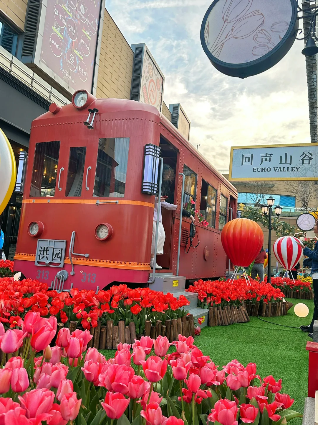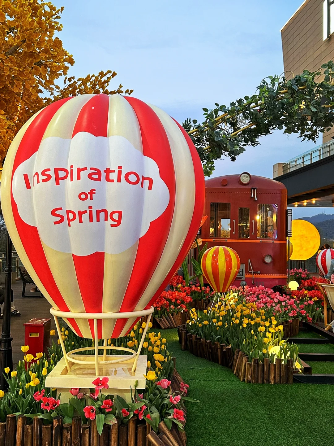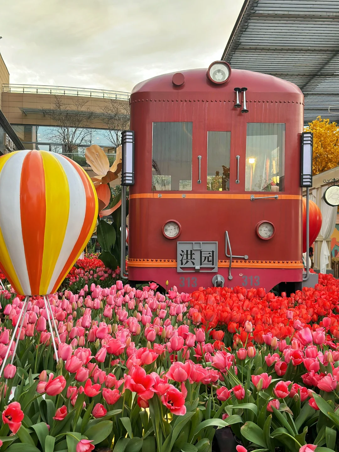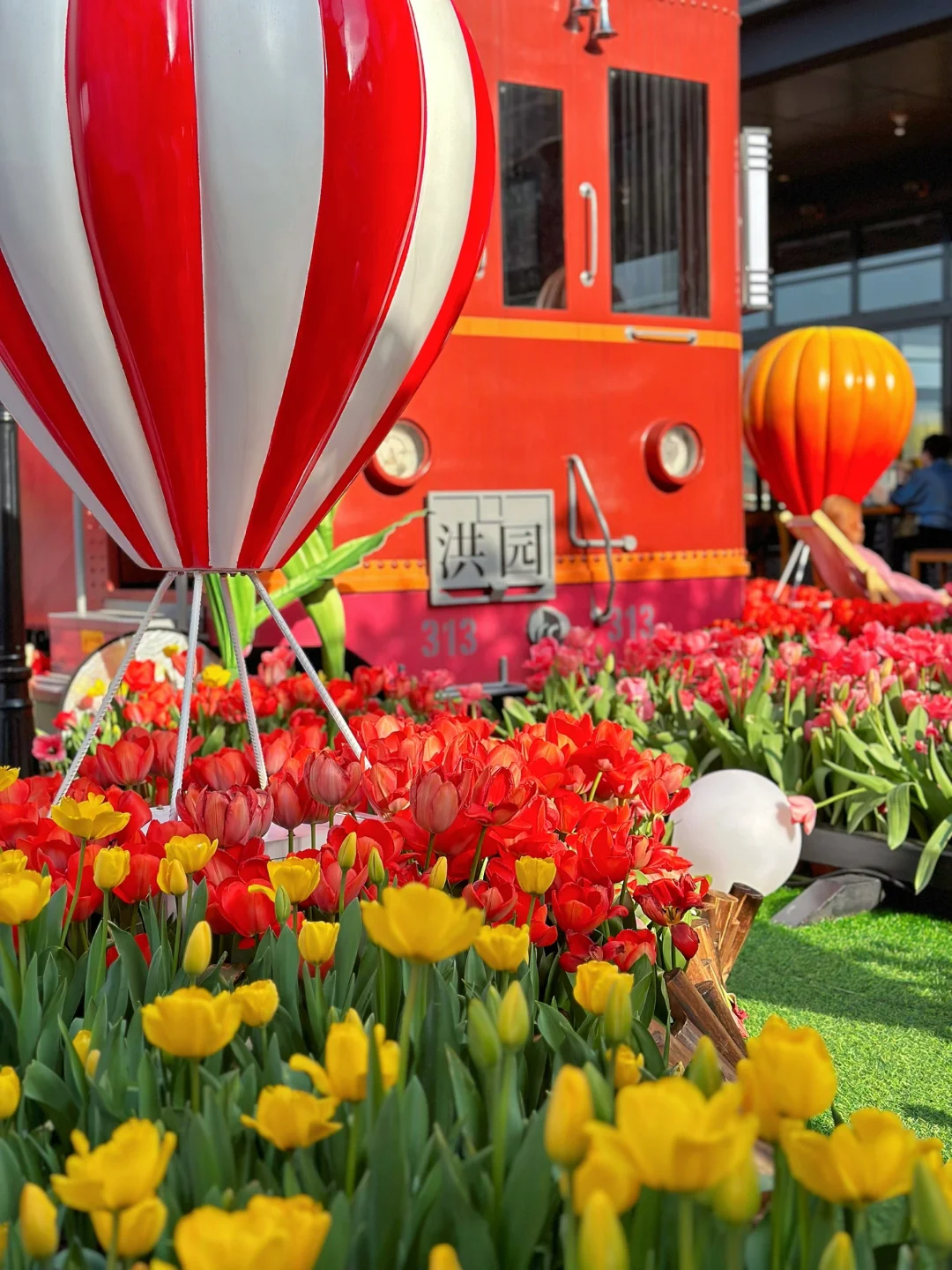 🌷具体位置在A座星巴克旁边的二楼露台。这里有三片郁金香,一片在一楼台阶两旁,一片在二楼露台(这里最多,有小火车、热气球、站台、座椅等),还有一片在去三楼的台阶上。
