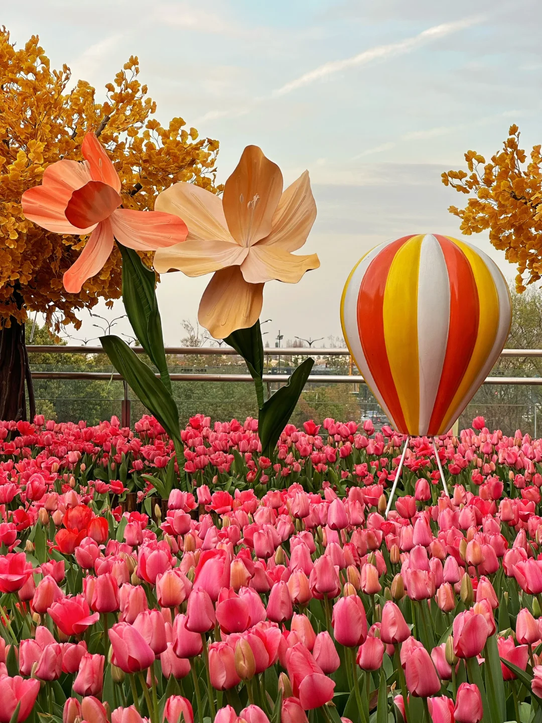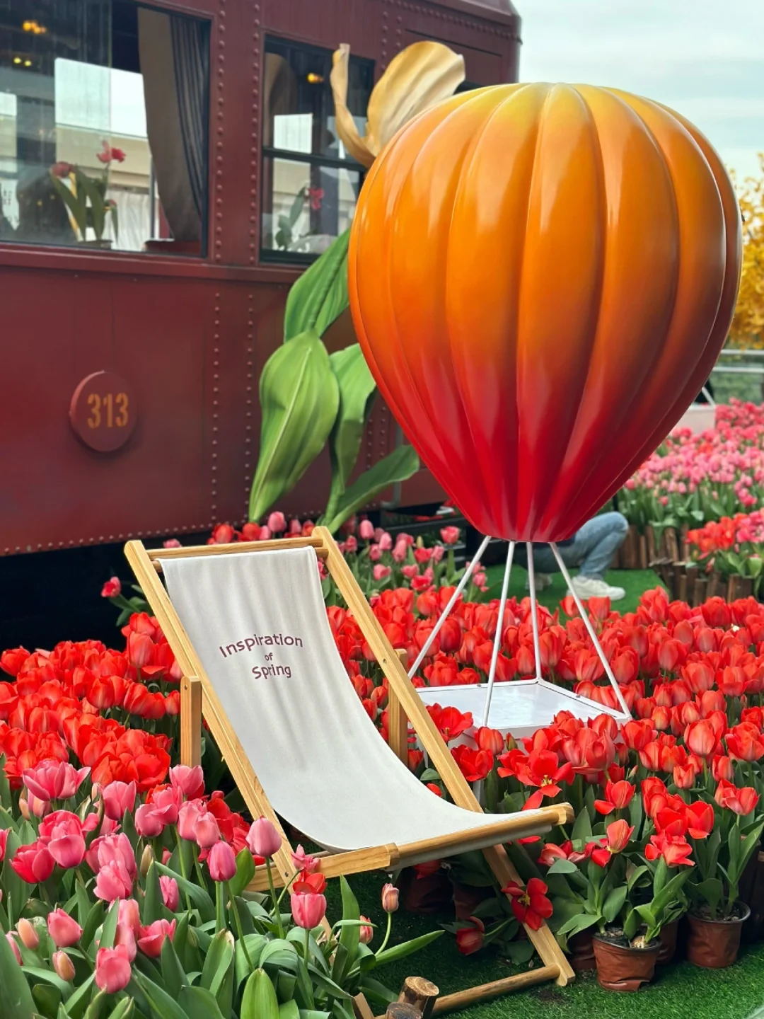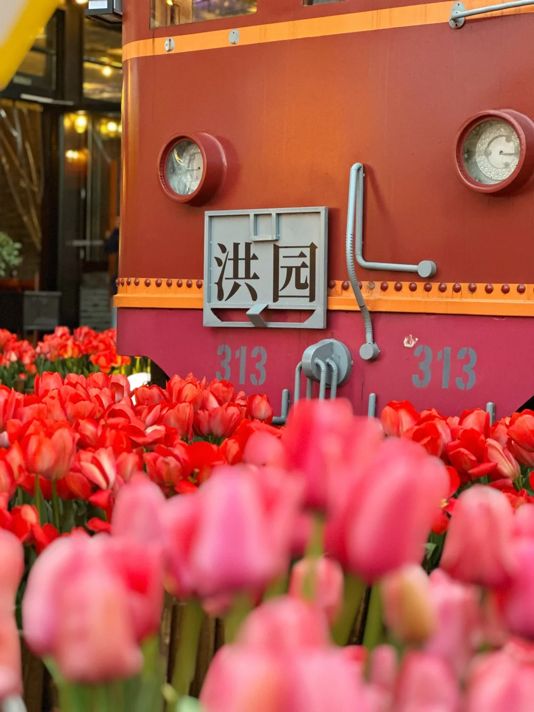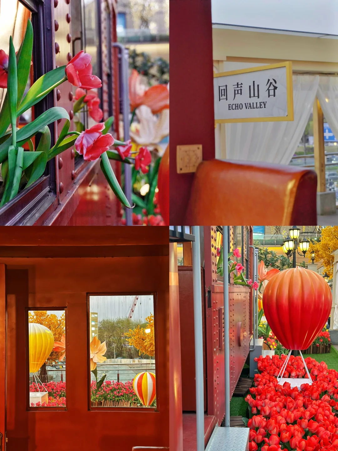 🌷具体位置在A座星巴克旁边的二楼露台。这里有三片郁金香,一片在一楼台阶两旁,一片在二楼露台(这里最多,有小火车、热气球、站台、座椅等),还有一片在去三楼的台阶上。