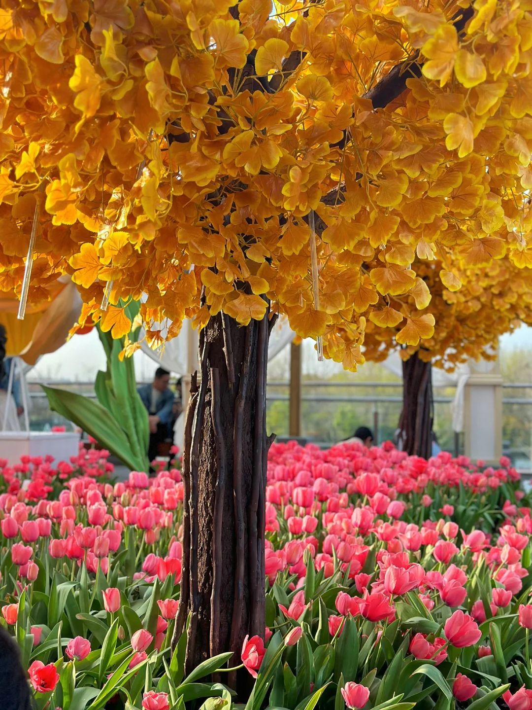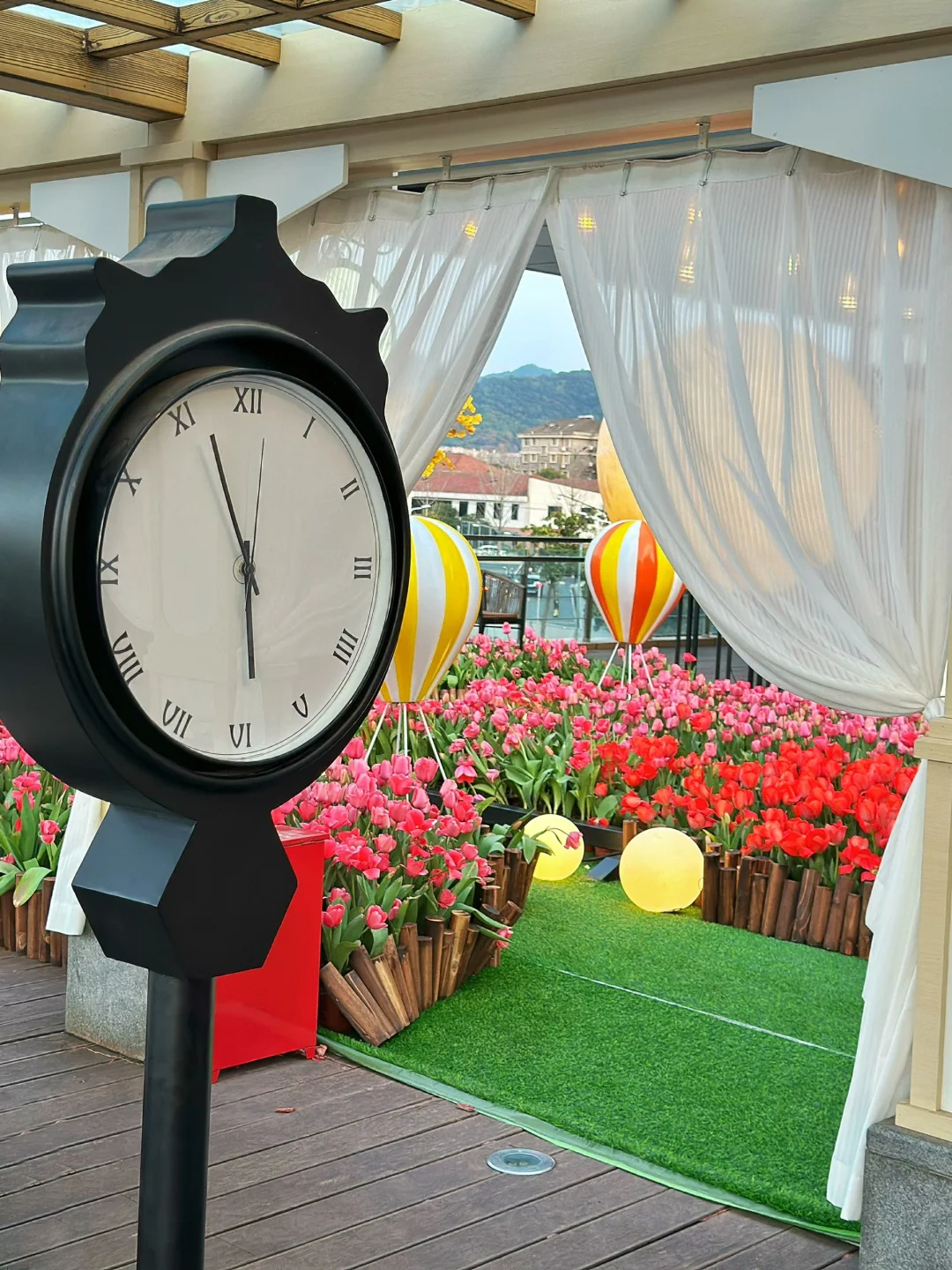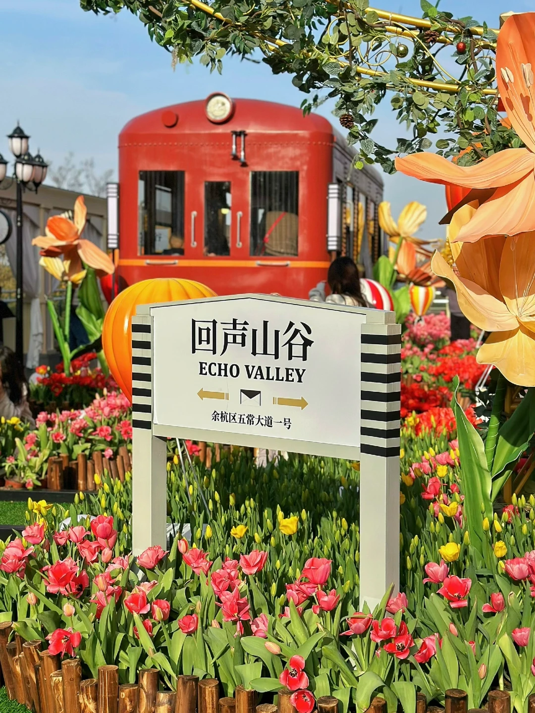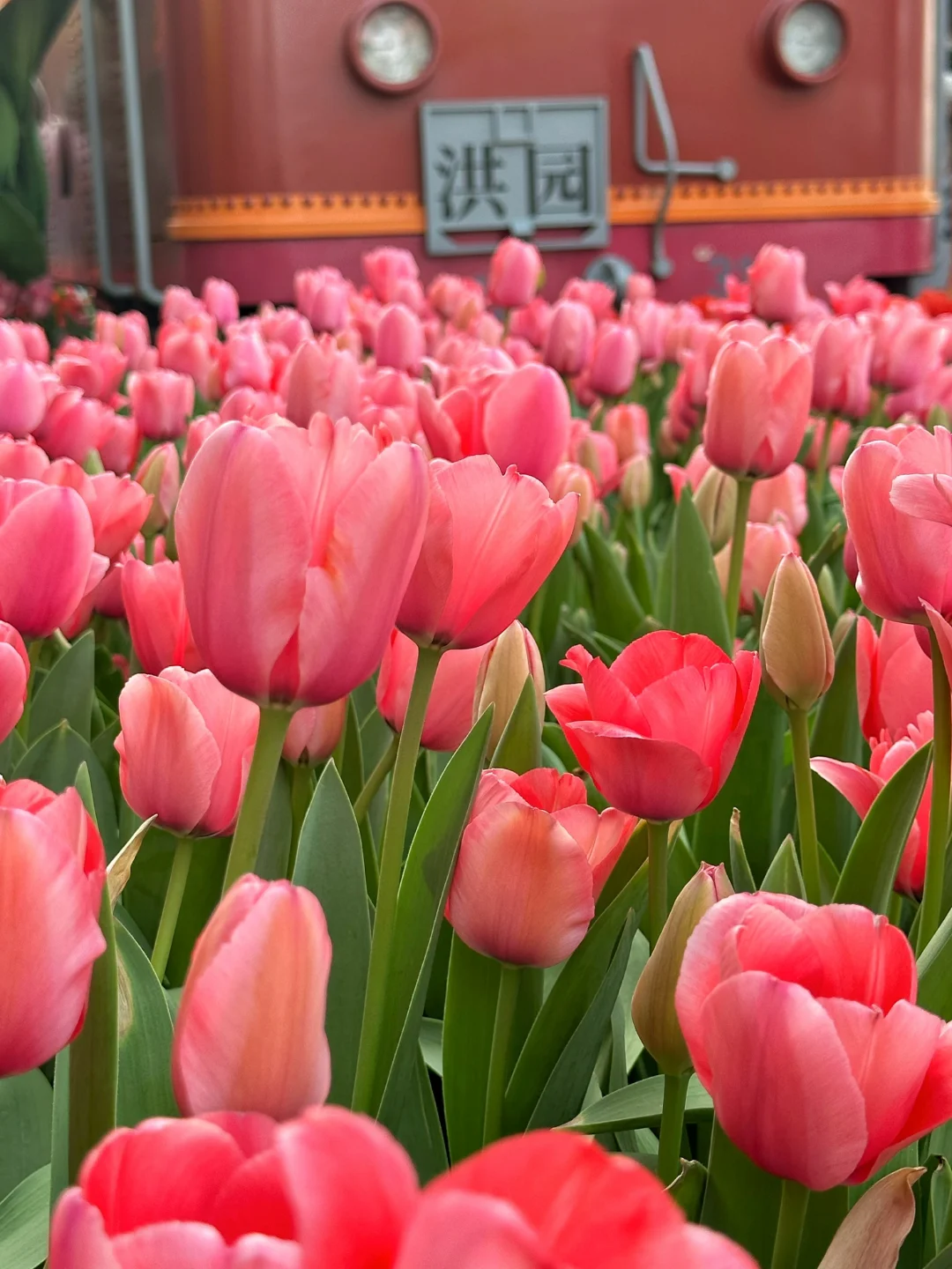 🌷具体位置在A座星巴克旁边的二楼露台。这里有三片郁金香,一片在一楼台阶两旁,一片在二楼露台(这里最多,有小火车、热气球、站台、座椅等),还有一片在去三楼的台阶上。