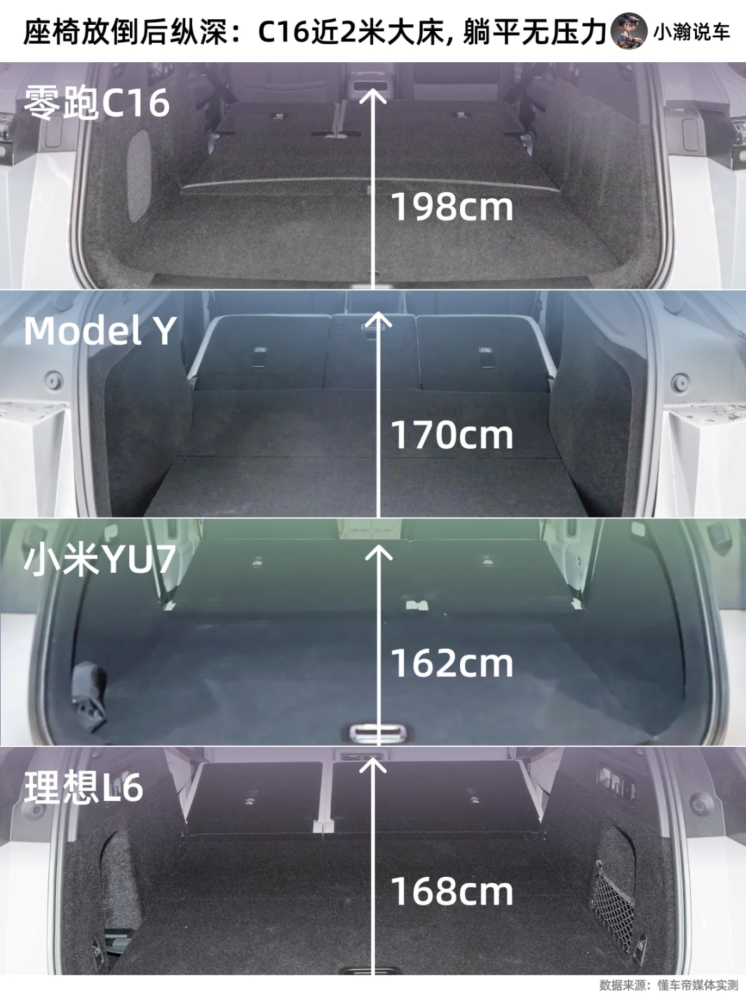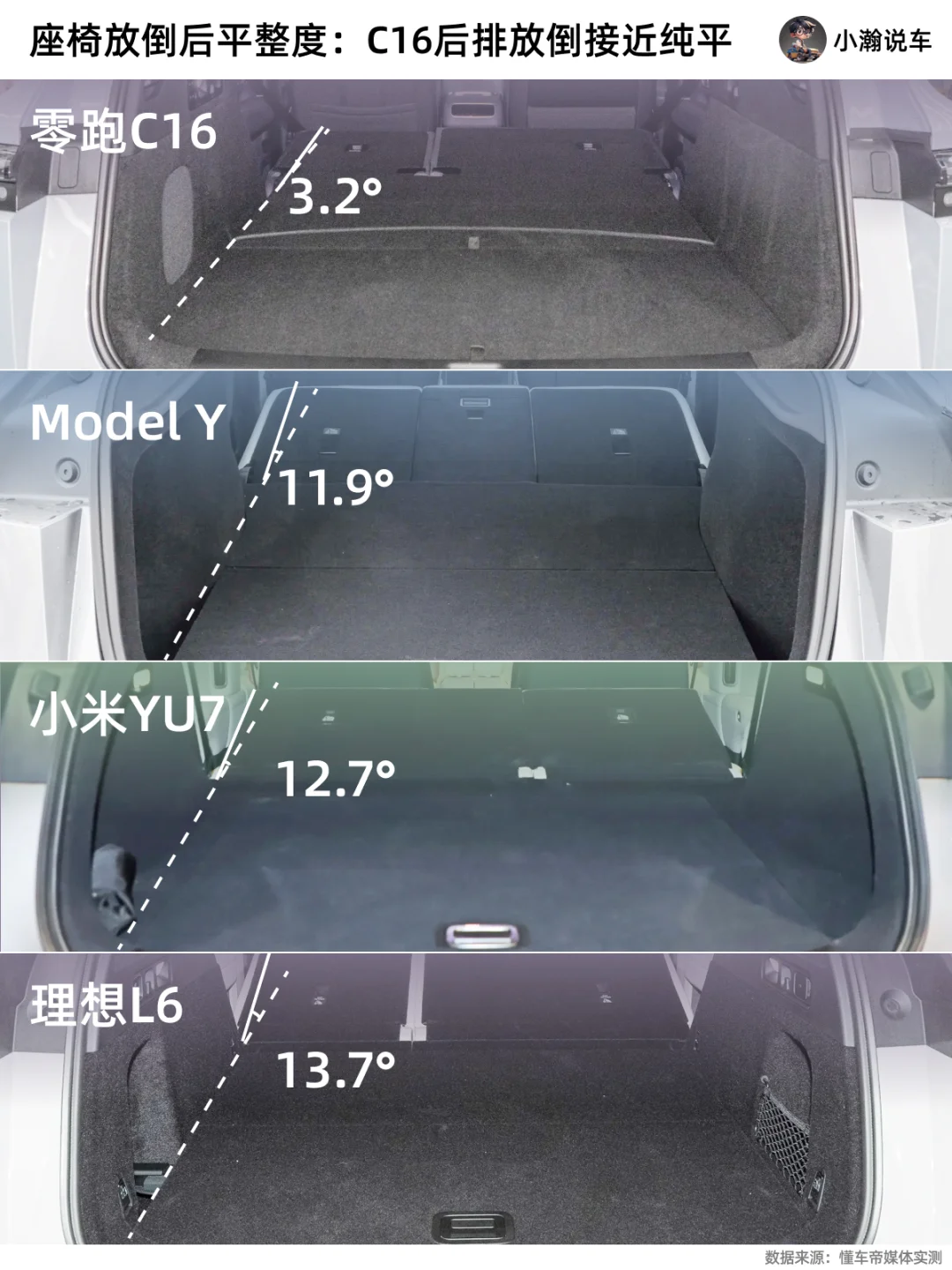 零跑C16拥有2825mm的轴距,5座形态下后备箱面积可达1.1m²。二排座椅放倒后,纵深更是接近2米,形成一个完完全全的“大床房”。1.8米身高躺在里面,腿能伸直、头不悬空,甚至还能翻个身。后备箱和座舱的过渡特别平整,落差仅3.2度,没有 “台阶感”,铺个睡袋就能直接睡,比很多SUV改床车时垫垫子、找平的操作省心太多。