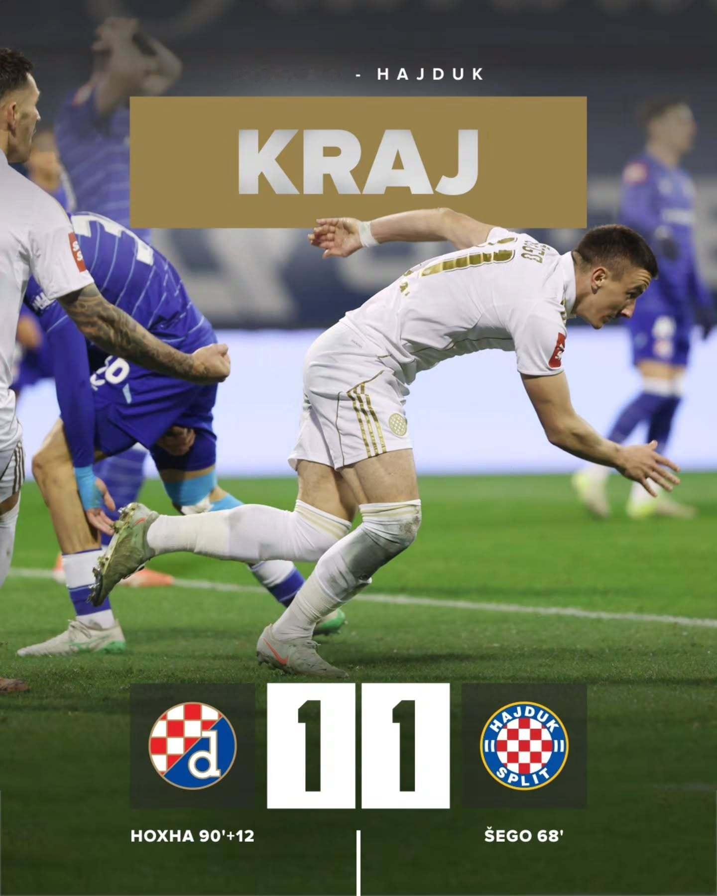 克罗地亚甲级联赛 萨格勒布迪纳摩主场与哈伊杜克队1:1握手言和,本纳赛尔🇩🇿、雷比奇🇭🇷均首发出场。🤝🏻ac米兰名宿