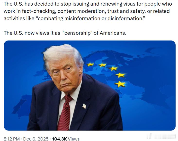 美国决定停止向从事“事实核查、内容婶查、信任与安全”或其他类似“打击错误信息或虚假信息”等工作的人员发放和续签签证。美国方面现在认为,这类工作属于对美国人的 “婶查”。