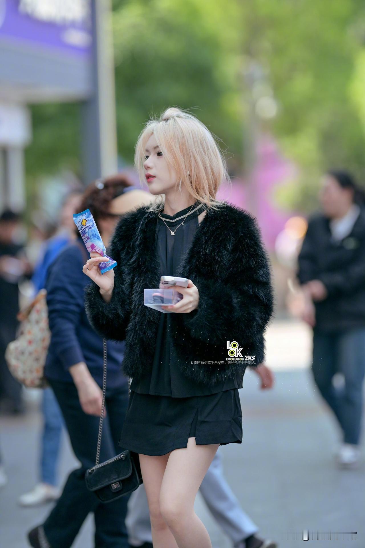 夜晚的街头,时尚穿搭,黑皮草外套搭配黑色短裤,优雅又帅气!