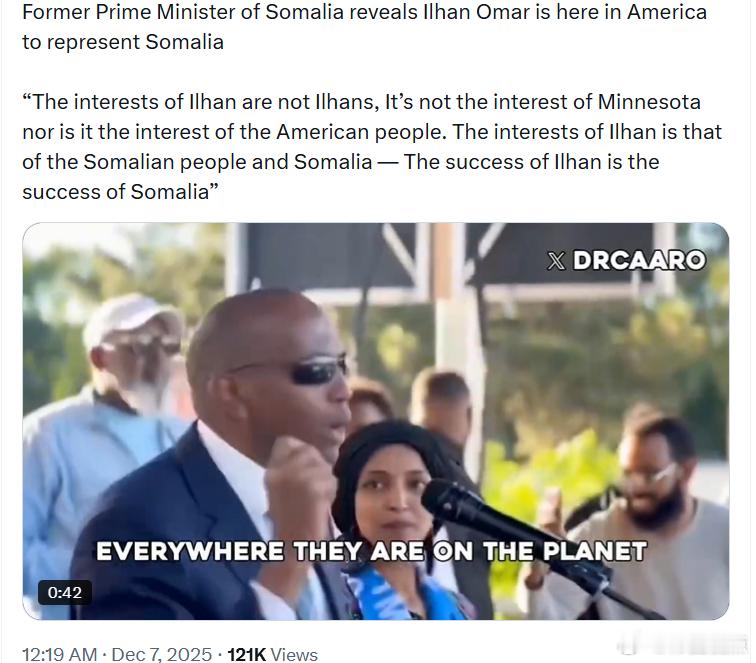 索马里前总理表示:伊尔汗·奥马尔来到美国是为了代表索马里“伊尔汗的利益不是她个人的,也不是明尼苏达州的利益,更不是美国人民的利益。伊尔汗的利益是索马里人民和索马里的利益——伊尔汗的成功就是索马里的成功。”