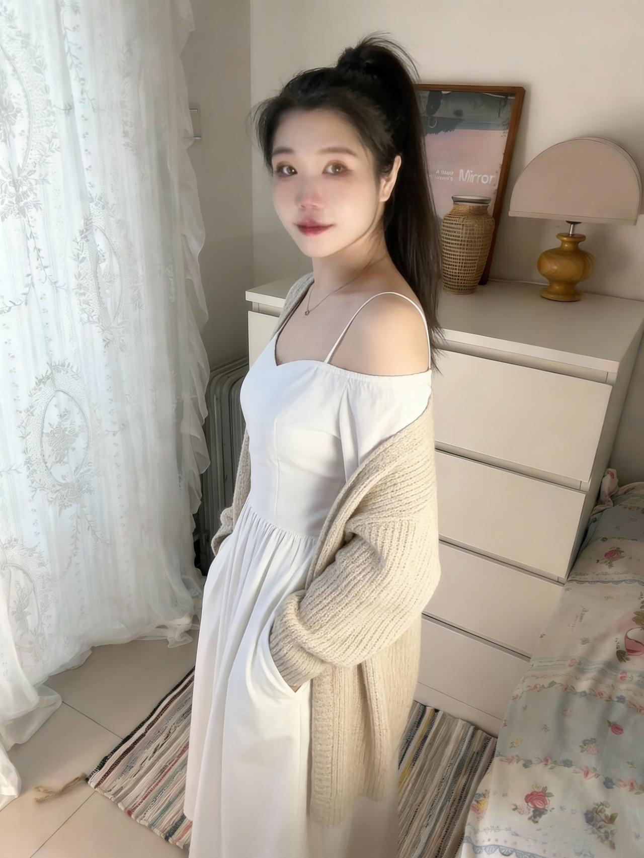 白裙雪肤映娇容,黑发垂肩眼带慵。 一室温柔藏静好,不随尘俗逐东风。