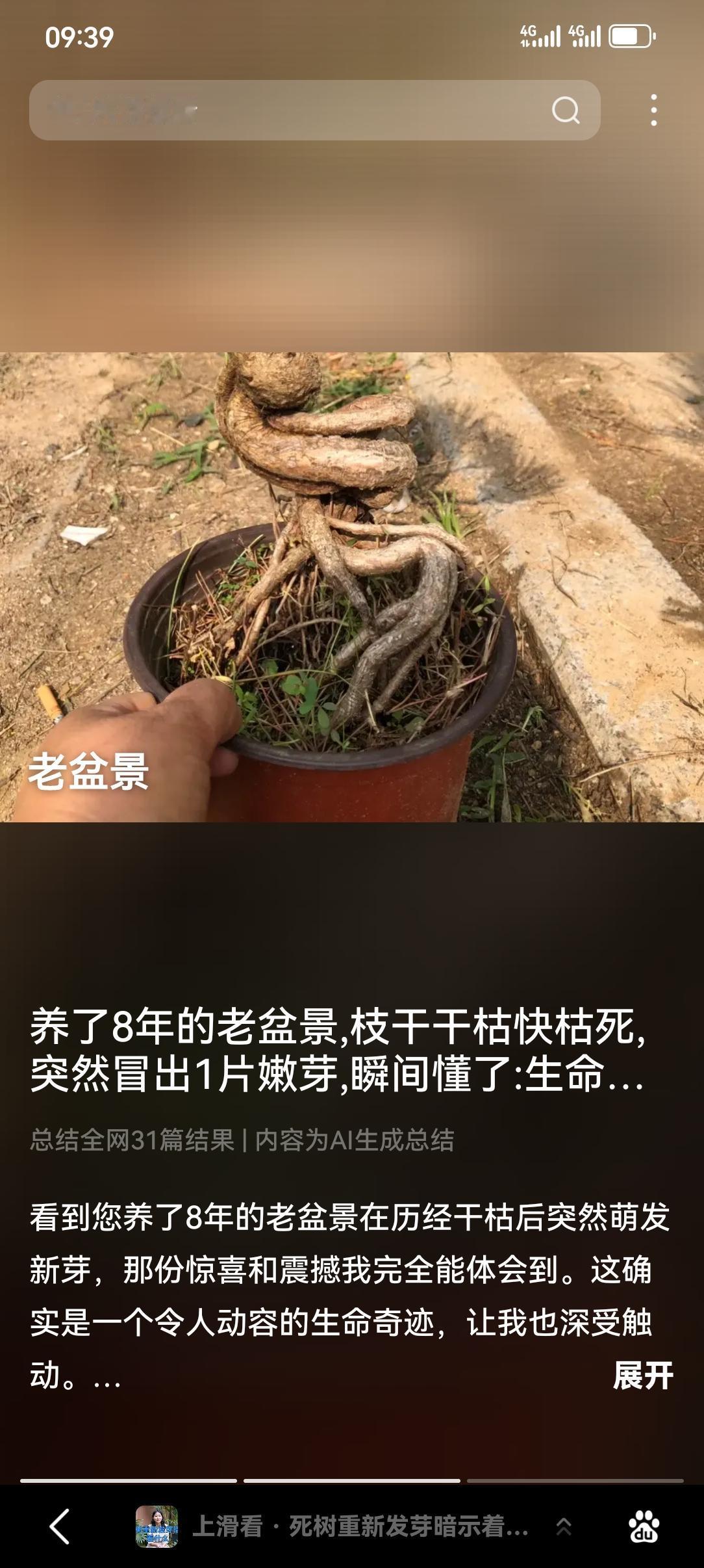 养了8年的老盆景,枝干干枯快枯死,突然冒出1片嫩芽,瞬间懂了:生命从不会认输 去年冬天最冷的时候,阳台那盆养了8年的雀梅盆景差点扔了。枝干皱巴巴的,叶子掉光不说,刮大风时还断了两根老枝,摸上去干硬得像枯木,浇了半个月水没半点反应,连养花的老师傅都劝我:“根大概率烂了,没必要耗着。” 当时心里舍不得,毕竟陪了我这么多年,见证过几次搬家,没事就爱蹲在阳台摸它的枝干,看叶片冒新芽、结小花。最后没扔,只是减少了浇水频率,偶尔搬去晒晒太阳,没抱任何希望,权当留个念想。 今早洗漱完去阳台晾衣服,余光瞥见盆景里有抹嫩绿,凑近一看瞬间愣住了——干枯的老枝缝隙里,钻出来一片小小的嫩芽,嫩得发亮,顶着一层细绒毛,在满盆枯色里格外扎眼。明明枝干看着毫无生机,底下的根却悄悄攒着力气,熬过长冬,熬过低谷,硬生生憋出了新芽。 突然就被戳中了。人这一辈子,不就像这老盆景吗?总有几段日子过得潦草又灰暗,觉得前路迷茫,熬不下去,甚至怀疑自己是不是就这样了。可就像这嫩芽藏在枯枝里,希望也藏在困境里,只要不放弃,默默扎根,慢慢蓄力,总有一天能冲破灰暗,冒出属于自己的光亮。 生活不会一直糟糕,低谷过后,皆是坦途。那些熬不过去的难,扛不住的累,终会成为成长的养分,等时机到了,就会迎来新生。愿我们都能像这盆景嫩芽,纵处低谷,亦向阳而生,不言放弃,静待花开🌱