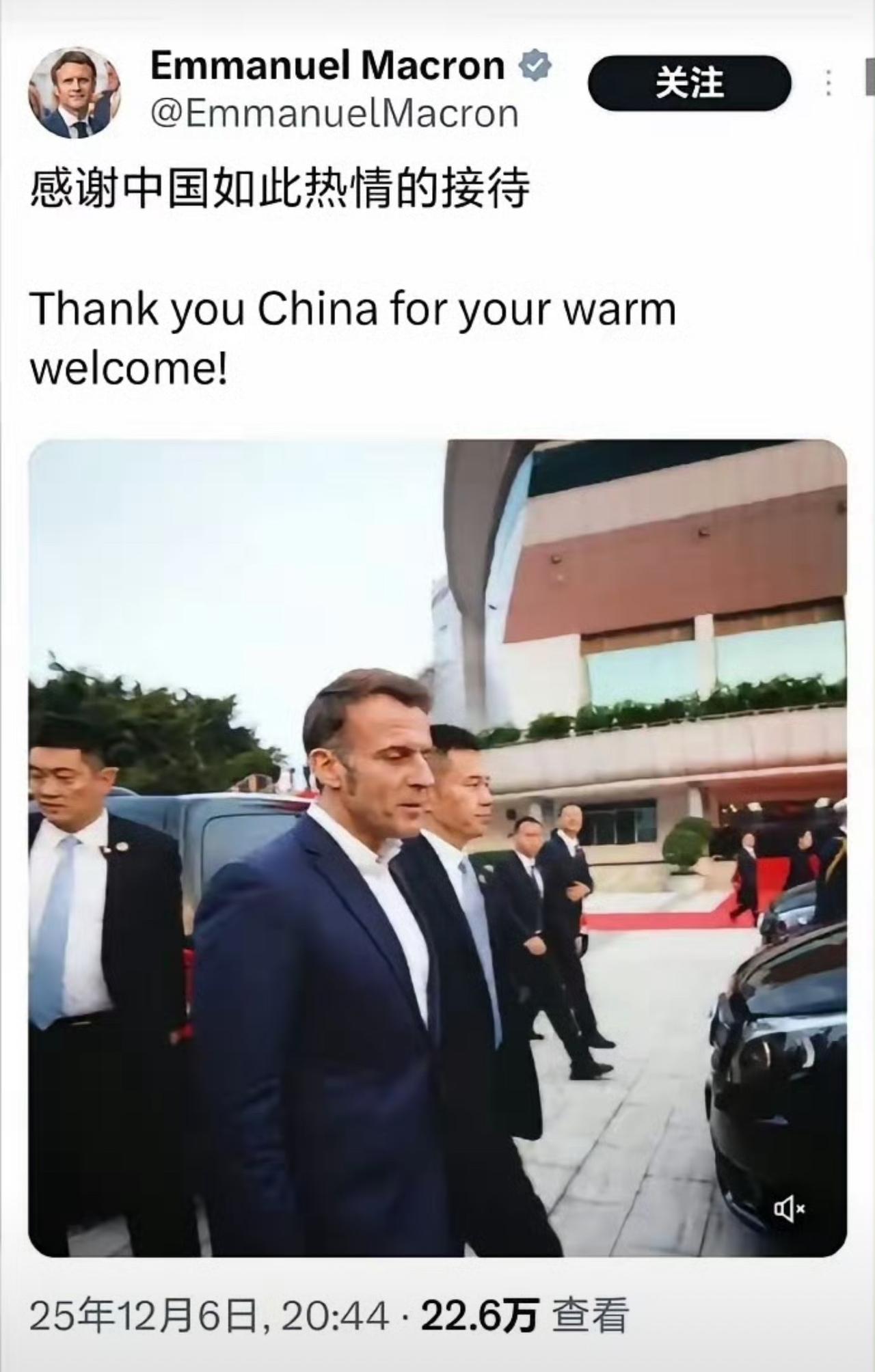 哈哈哈哈哈,看得出来这次马克龙在中国玩美了,即使回去了也意犹未尽!特意在外网用中文感谢中国的热情!估计他很快会再来的!下次来小马哥来东北吧,东北人更热情!以小马哥这么好动的性格,可以来体会一下跟东北人打雪仗!那估计这帮保镖得彻底疯了[捂脸][捂脸][捂脸][捂脸]法国马克龙