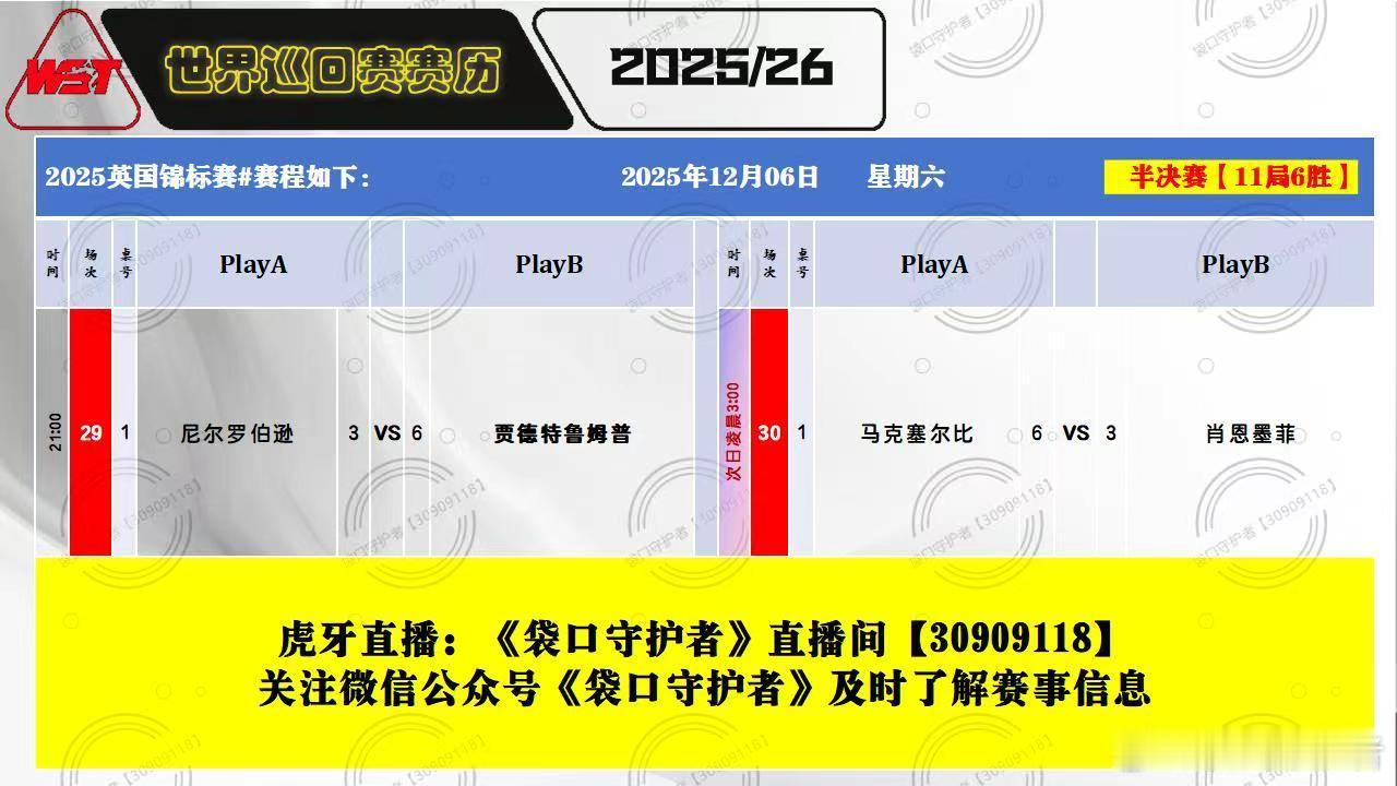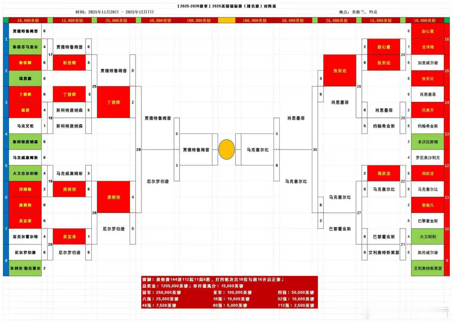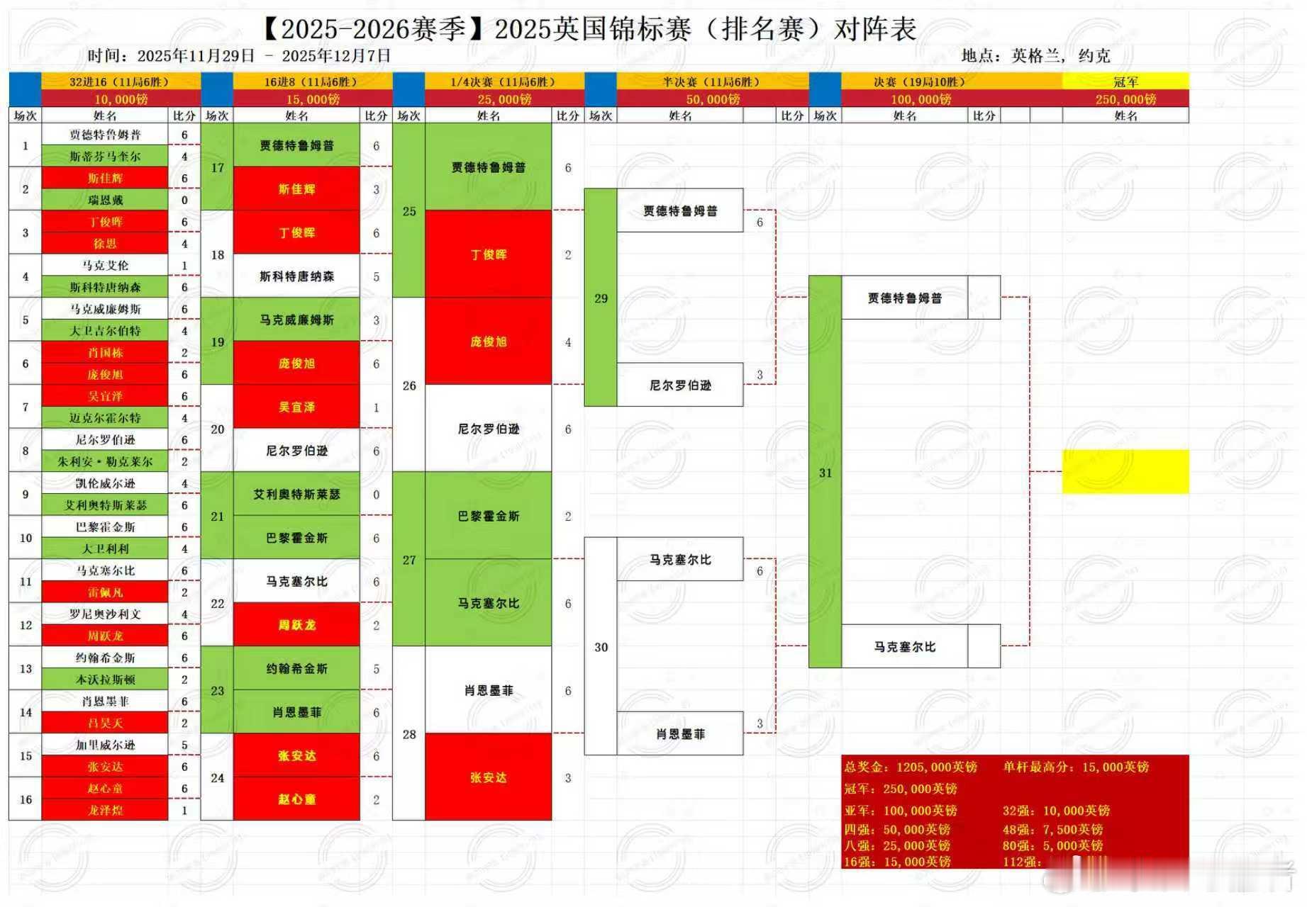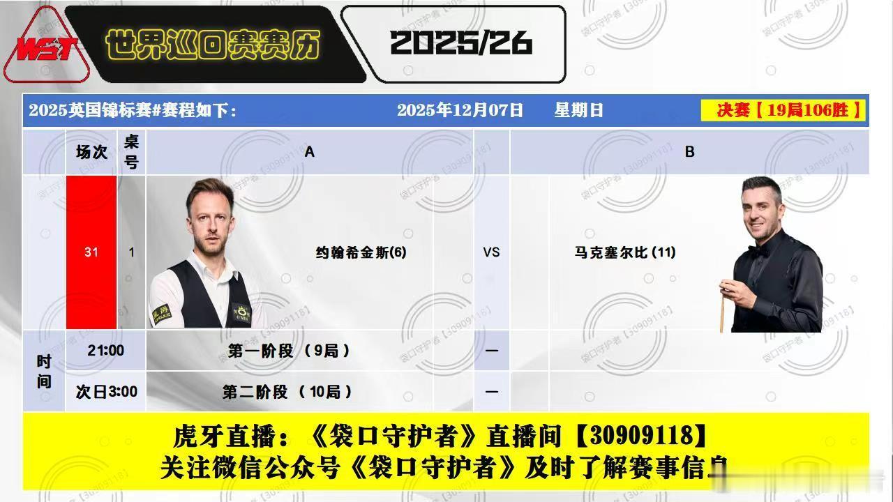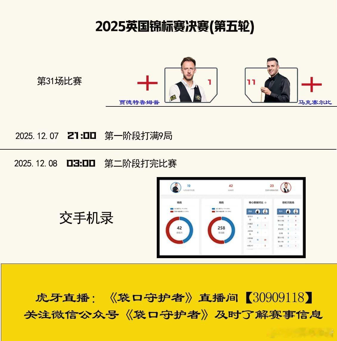 2025英国锦标赛决赛(19局10胜)马克塞尔比VS贾德特鲁姆普第一阶段 2025.12.07日 星期日 21:00 打满9局第二阶段 2025.12.08日 星期一 03:00 打完比赛