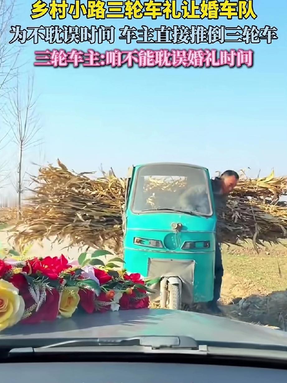 山东大哥骑三轮去地拉棒秸,在返程路上,恰巧与一辆婚车相遇,由于路太窄,大哥二话没说,自动下车把自家三轮推翻,先让婚车过去,还怕结婚耽延了时辰,感动的司机双手递给大哥一个红包,以表谢意!司机双手递红包,一个动作完美释全了对大哥的尊重!你抬我敬,是来自双向奔赴的情感!山东大哥憨厚,实在,不但没“劫”婚车要喜钱,反而礼让婚车,山东大哥是我们学习的榜样!