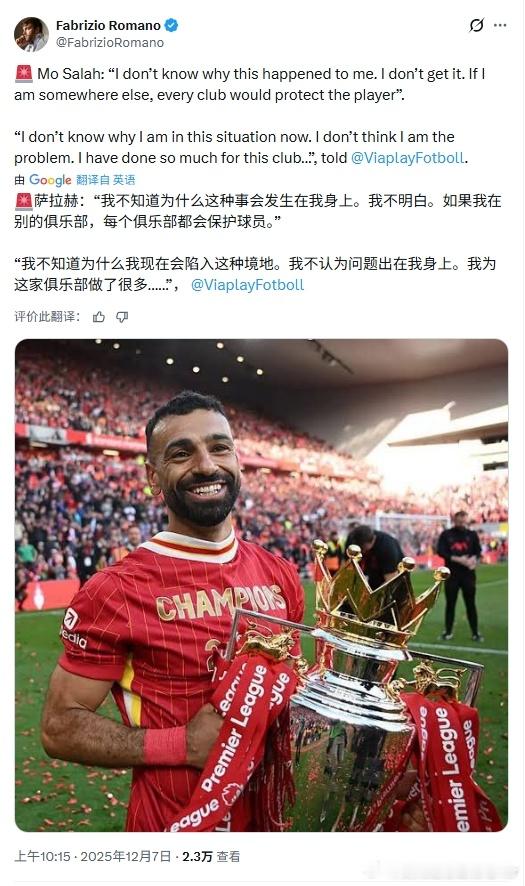 丝毫不让我意外的场景还是发生了在3:3被利兹联绝平的比赛结束之后本场依旧没有得到上场机会的萨拉赫,对着镜头公开逼宫说实话,这个场面发生的甚至比我预期来的更晚了一些过去3场比赛全部替补,只得到了45分钟的上场时间,对于萨拉赫这样的球员来说绝对是难以接受的而舆论似乎也将本赛季卧铺大部分的锅扣在了他的身上事情到底会怎么发展,静观其变吧这注定会是个无比动荡的赛季利物浦利兹联3比3利物浦