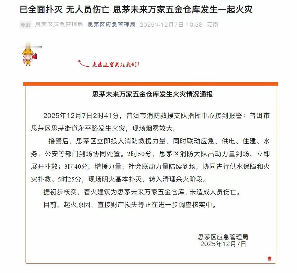 注意!近期火情较多,千万要注意用火、用电、用气安全!7日最新火情:一烟花爆竹仓库凌晨突发火情,烟花爆竹被引燃,火光、烟花照亮夜空,事发云南普洱思茅。今天(12月7日),有网友爆料称,普洱思茅区一处烟花爆竹仓库凌晨突发大火,库存烟花爆竹被引燃。从网传视频中可见,事发现场火势凶猛,现场不断传出爆竹的爆炸声,并不时有烟花在夜空中绽放。事发后,当地消防等多部门紧急赶赴现场处置。据悉,本次火灾发生在7日凌晨2点41分左右,起火单位为思茅未来五金仓库,起火面积约1500平米,火灾无人员伤亡报告。具体事发原因尚在调查中。热点 云南普洱思茅区今晨发生火情 普洱思茅区一五金仓库起火引燃烟花爆竹