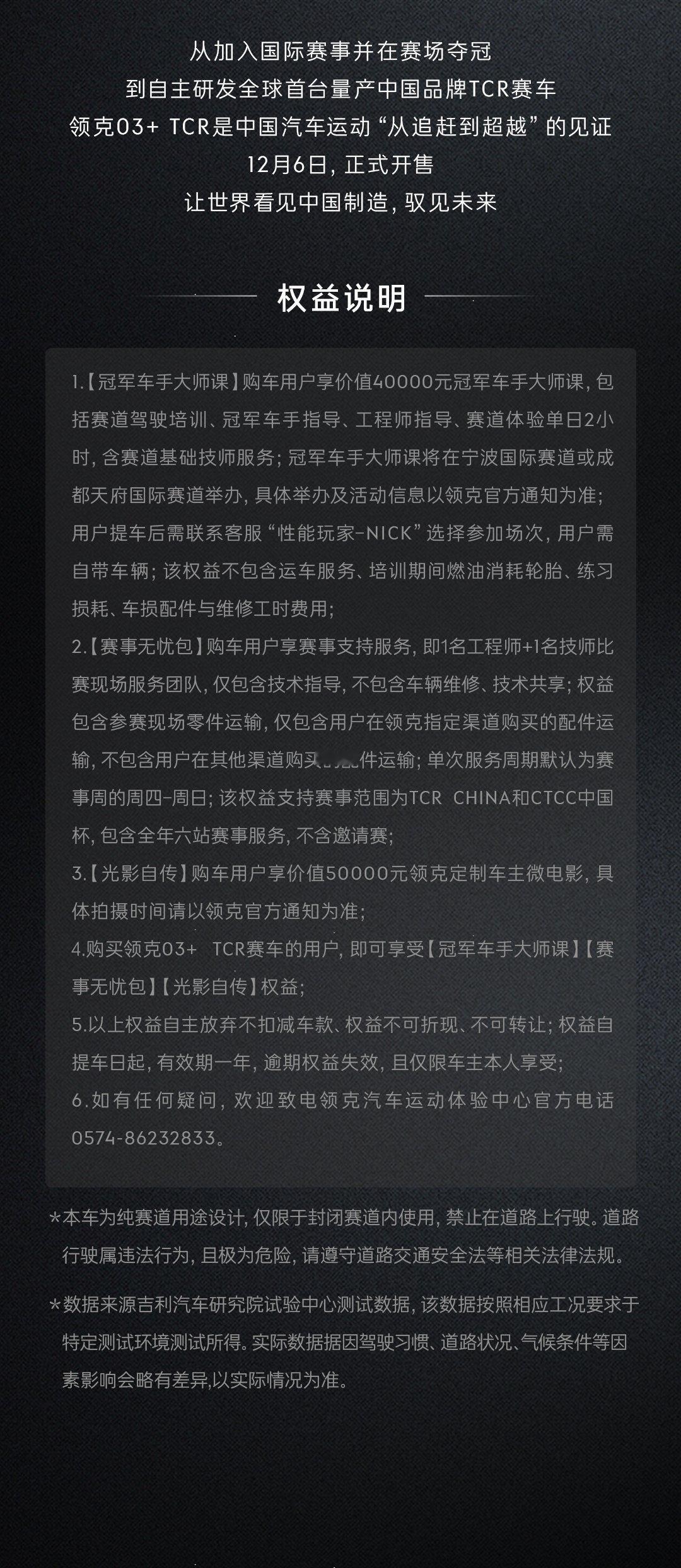 【140 万元!全球首台中国品牌量产 TCR 赛车领克 03+ TCR 开售】“CO 客大会”上,全球首台中国品牌量产的 TCR 赛车 —— 领克 03+ TCR 正式开售,官方售价为 140 万元 / 台。该车的购车权益还包含价值 4 万元的冠军车手大师课、赛车工程师技术服务团队指导及参赛现场零件运输、价值 5 万元的领克 03+ TCR 车主定制微电影。汇总新车主要信息如下:新车的动力系统基于 T6 发动机升级了散热部件,搭载 1046 六速序列式变速箱,采用拨片换挡设计。制动系统方面,新车搭载前六活塞一体卡钳 380mm 制动盘、后两活塞 290mm 制动盘。此外,这款新车还匹配全新设计的 Gen3 空气动力学套件,车内设有防滚架、专业赛车座椅等设施。具体动力方面,新车峰值马力 350Ps,峰值扭矩 420N・m,包含车手的目标重量为 1265kg。值得一提的是,该车还更换涡轮并重新标定程序,可全面优化直线动力输出。