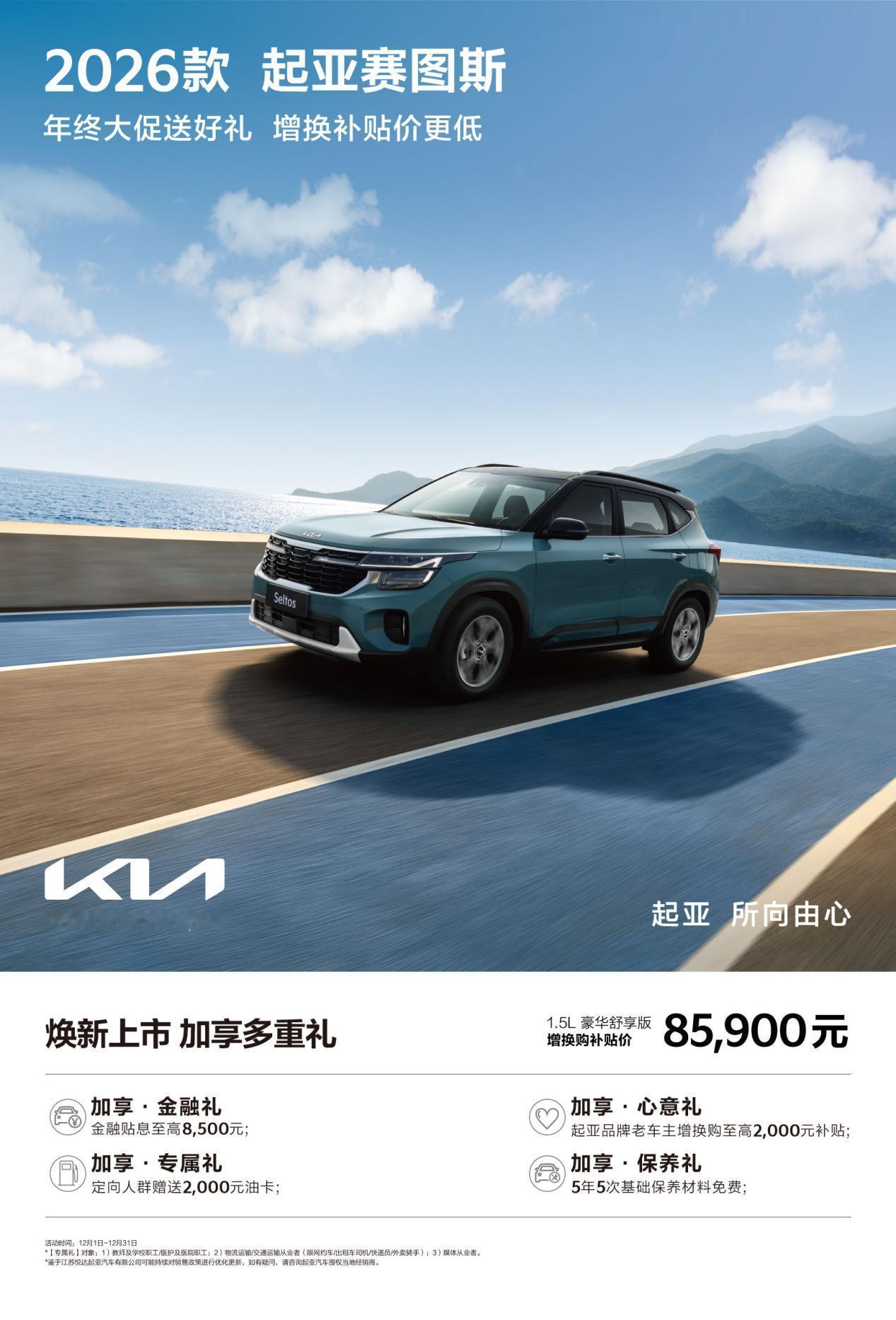 细节控的福音!2026款赛图斯,带来同级领先的舒适体验 对于注重生活品质的年轻人来说,座驾的舒适度绝不能凑合。2026款起亚赛图斯最打动人心之处,在于它彻底打破了合资入门SUV“配置简陋”的刻板印象。其1.5L豪华舒享版不仅配备了同级罕见的前排座椅通风与加热功能,让你告别夏日闷热和冬日冰冷,这份领先的诚意远不止于此,它还搭载了SVM 360°全景影像和BVM侧后方影像,让停车、并线都变得轻松自如。再加上10.25英寸炫彩仪表盘、BLE手机蓝牙钥匙以及支持百度智能互联的Kia Connect系统,从舒适到智能,每一处细节都为你周全考虑。想要拥有这份同级领先的舒适与便捷,目前的购车政策相当给力:1.5L豪华舒享版综合增换购补贴后仅需85,900元。此外,购车还可享受至高8,500元金融贴息以及5年5次基础保养材料免费等多重权益,让这份高品质的出行体验更轻松地拥有。