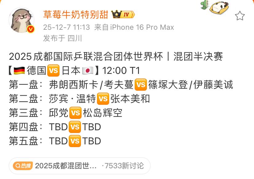 在2025成都国际乒联混合团体世界杯第二阶段循环赛中,中国8-3战胜韩国队,拿到第四个赛点,晋级决赛,女双第二局四个赛点,14-12,太精彩!蒯曼输了一局给金娜英,林诗栋丢一局张禹珍,明显有着优势。蒯曼,王曼昱女双也丢了一局。王楚钦,孙颖莎再次3-0零封对手,果然是天选混双!决赛详情如下所示! 国乒第一个晋级今晚决赛,日本队半决赛对阵德国,胜出者可以晋级决赛,对战中国队,所以,国乒今晚冲击三连冠! 预测决赛,中国对日本队。