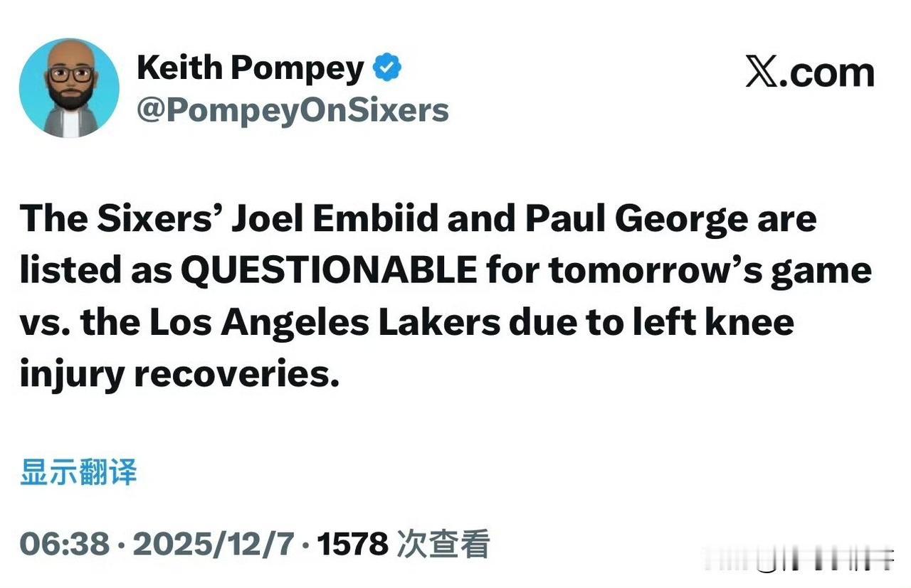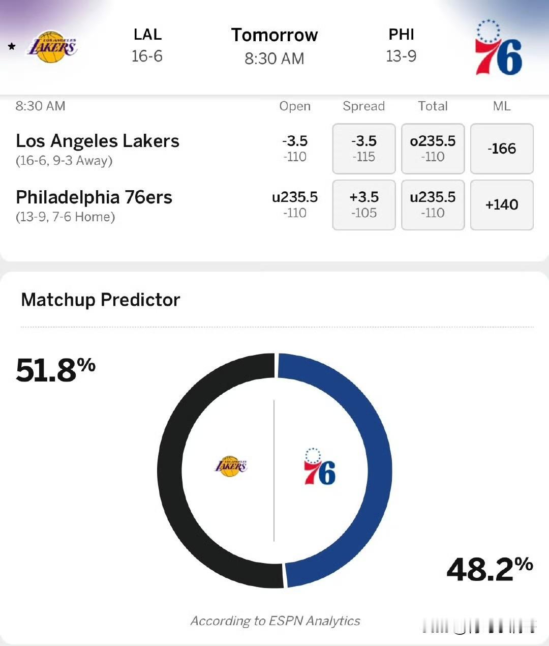 湖人vs76人比赛预告!!!湖人对阵76人比赛预测,湖人被看好! 北京时间12月8日,湖人来到费城挑战76人,目前湖人排名相对于76人还是有优势的,76人近期表现不稳定,战绩有所下滑,一起来看下比赛预告吧。 湖人伤病情况: 斯玛特继续养伤不打,詹姆斯出战成疑,问题不大,预计可以出战。 76人伤病情况: 恩比德和乔治也是出战成疑,预计都可以打,乌布雷确定不打了。 目前从ESPN给出的结果预测中,湖人以略高于五成的概率被看好可以拿下比赛,76人主场甚至是+3.5,主场被看衰了。 明天埃奇库姆的表现备受关注,这个年轻人打球很稳,而恩比德和乔治两个病号能打球已经不错了。 东契奇连续缺席了两场比赛,明天是他二女儿出生后的首场比赛,看他表现如何呢? 湖人 湖人赛程 nba 湖人 东契奇 76人 恩比德 乔治