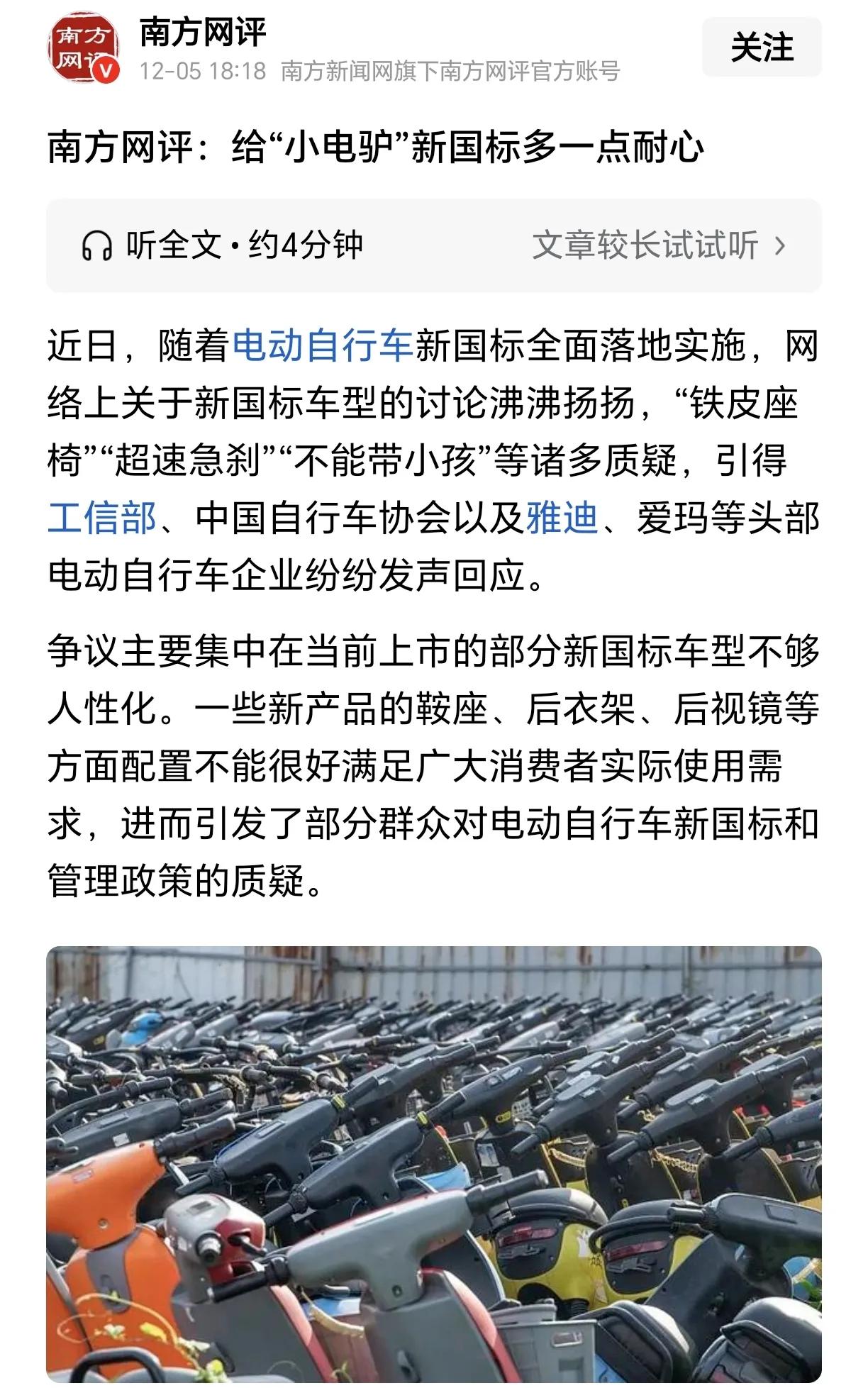 电动自行车新国标根本就是脱离实际的产物。 现在各路媒体专家又下场呼吁老百姓要多给新国标耐心。 那问题来了:老百姓为什么要接受个比原来产品价格更高甚至翻倍的废物,还要再花耐心成本给它? 很多普通人日常生活通勤出行、买菜送货……等等都靠一辆电动自行车,现在的新国标产品根本无法满足实际需求、价格还偏高,老百姓怎么能没有怨言? 至于说要多给耐心和时间? 抱歉,老百姓的生活不是做实验,是很难容下一点错误的,因为对普通人来说这样的错误成本太高昂了。