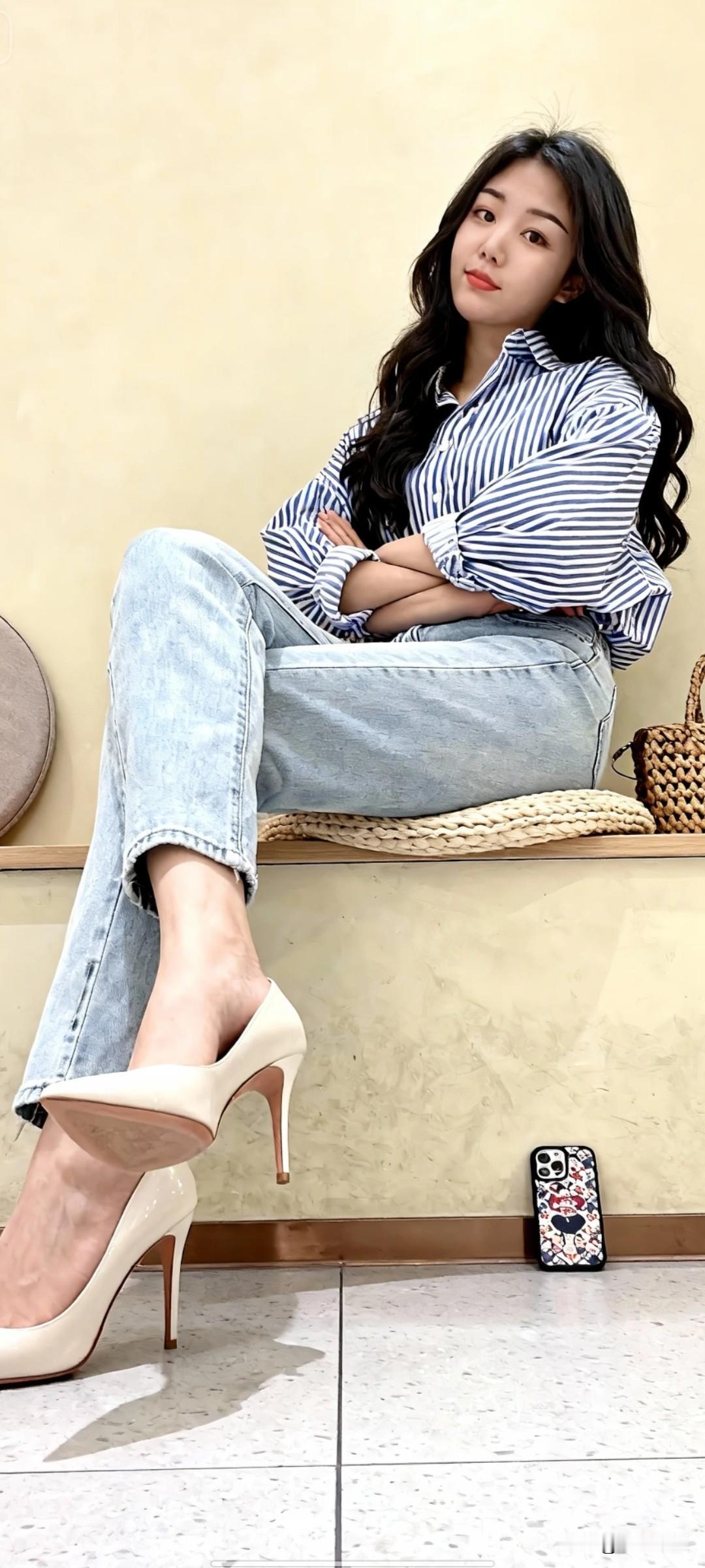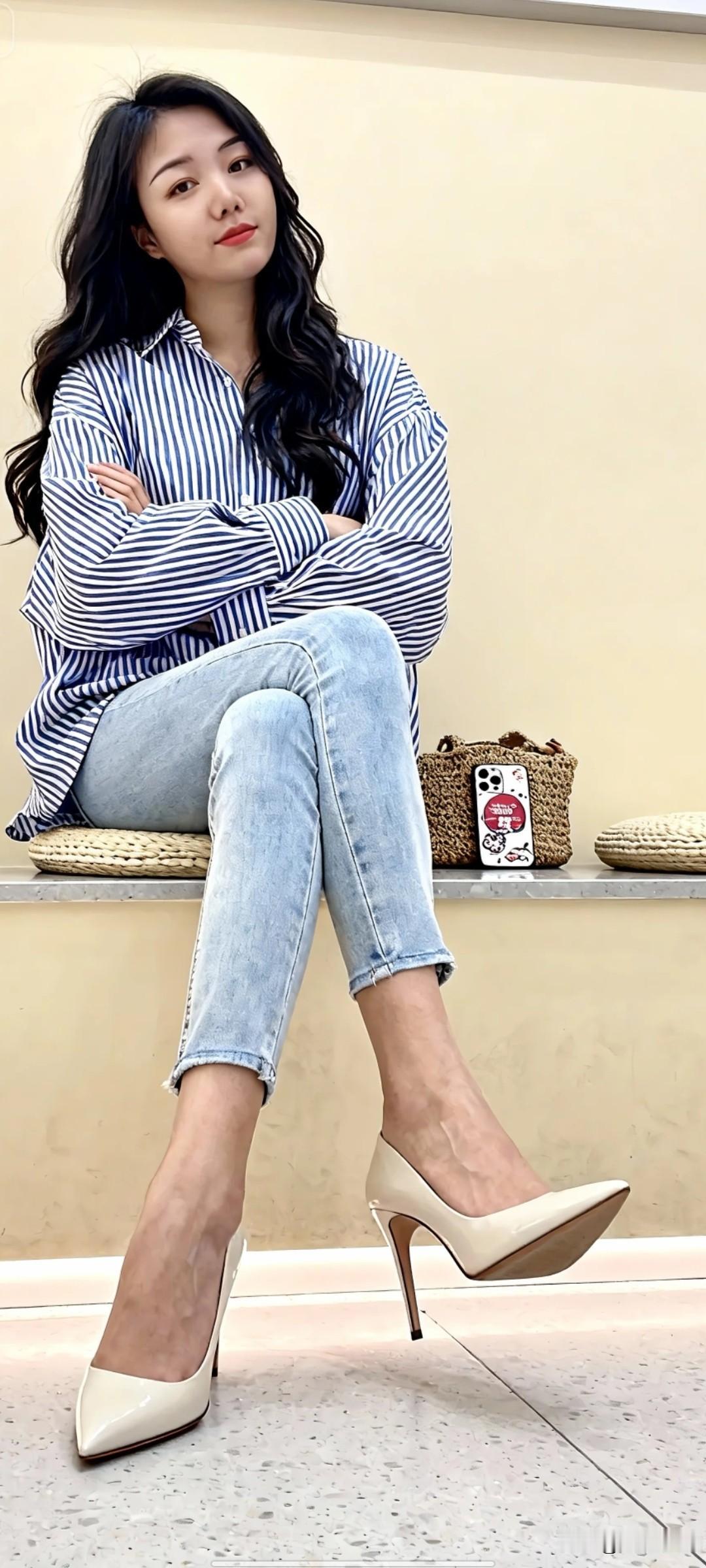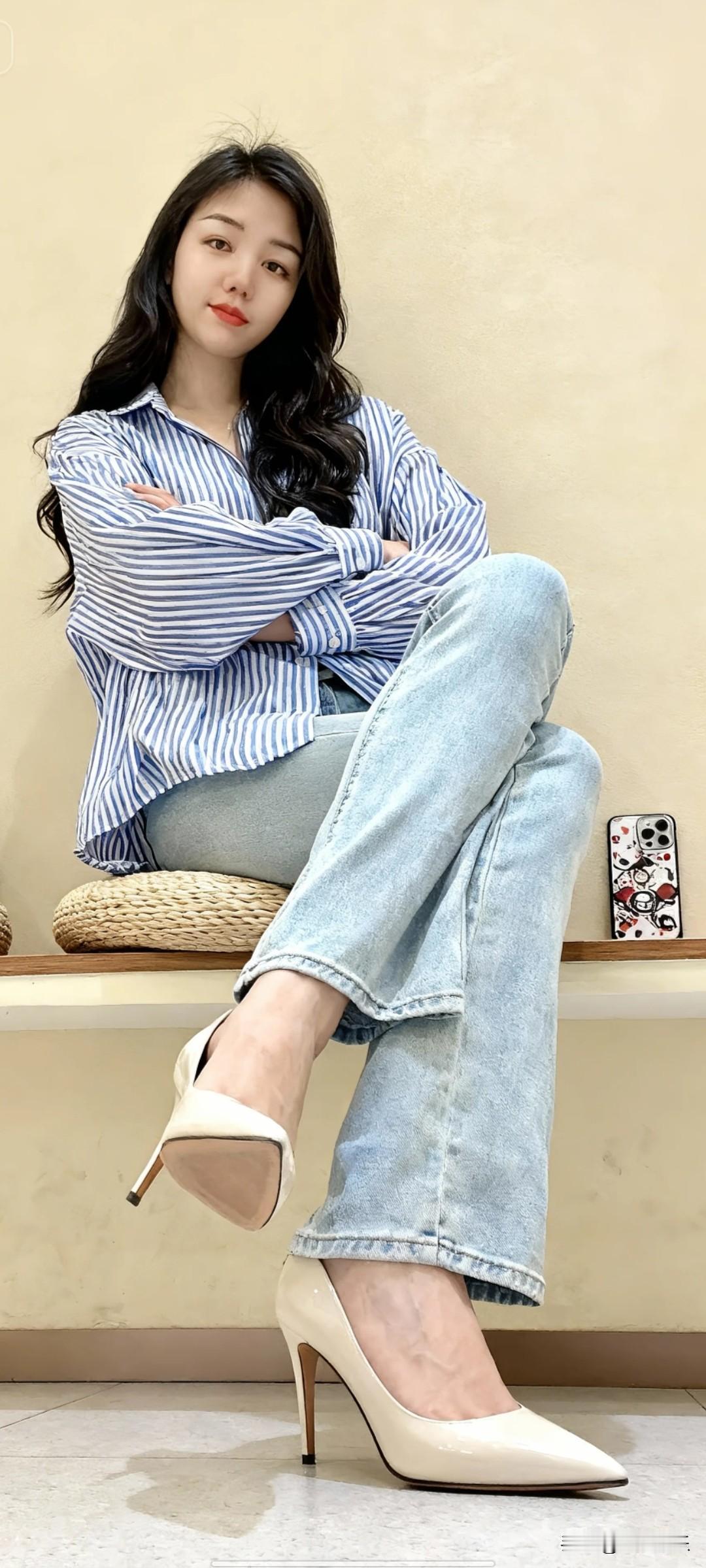 复古条纹衬衫搭配牛仔裤,优雅红底高跟鞋,都市时尚风!中年女人如何穿搭显高级,优雅?