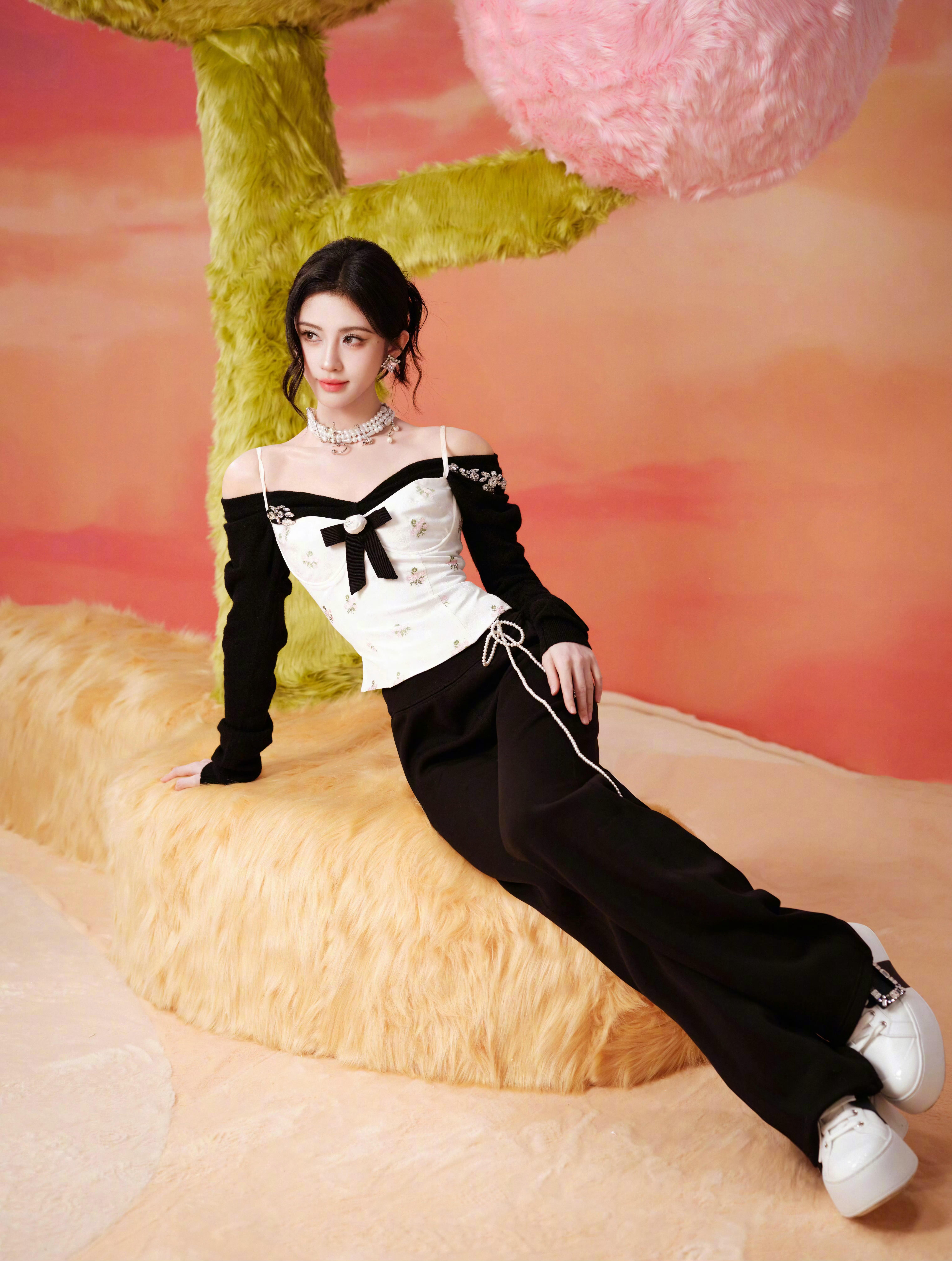 鞠婧祎 x SIINSIIN鞠婧祎SIINSIIN直播造型,一身黑白露肩上衣缀着蝴蝶结与碎花刺绣,搭阔腿裤自带复古精致感,珍珠项链的衬托,完全是优雅大小姐