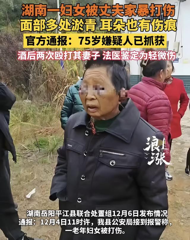 湖南女子遭75岁丈夫家暴:两天两顿打致精神失常,儿子的无奈戳中无数人心 本应安享晚年的年纪,却要在拳脚中苟且度日。近日,湖南平江县一起老年家暴事件引发全网揪心,被打女子满脸淤青、耳朵肿胀,精神状态已出现异常,而施暴的75岁丈夫已被警方抓获,可事件背后的隐情,远比处罚结果更让人揪心。 网传画面里的女子,留着一头潦草短发,身上套着明显不合身的男士衣物,眼神涣散,模样尽显狼狈。最让人心疼的是她的脸和耳朵,肿胀的痕迹清晰可见,全然没了老年人该有的安稳模样。 据知情人透露,女子的惨状源于丈夫的多次施暴,仅12月2日到3日两天内,她就接连遭到两次殴打。12月6日当地官方通报证实了家暴事实,明确男子是酒后动手,经法医鉴定,女子伤情为轻微伤,涉事丈夫已被依法控制。 可事情远没到尘埃落定的时候,一个关键疑问戳中了大众的痛点:女子的家人为何没能护住她? 原来女子育有一子,常年在外打工讨生活。早已知晓母亲屡遭家暴的他,曾把母亲送到亲戚家暂避,可无奈亲戚突患疾病,根本无力照料,他只能又把母亲送回那个“伤人”的家,这份身不由己的无奈,让不少网友唏嘘不已。 除此之外,事件还藏着不少待解的疑点。通报里施暴丈夫75岁,可从视频中看,女子年纪明显要小不少,有网传信息称她实际才四十多岁,这年龄差背后是否另有隐情,目前还需官方进一步通报。 更有网传细节听得人脊背发凉:女子之所以剪去长发,是因为之前被打时,长发会被丈夫揪住,根本没机会挣脱;此前她曾因家暴被打进医院,可出院后丈夫非但没收敛,反而变本加厉继续施暴。不过这些信息均为网传,真实性有待核实。 丈夫被抓,算是给了大众一个初步交代,可大家更关心的是:精神失常的女子,往后该何去何从? 从她身上不合身的衣物就能看出,这个家庭本就不宽裕,否则儿子也不会常年在外奔波。就算儿子能把母亲接去身边,一边要打工赚钱,一边要照料精神状态异常的母亲,又如何能做到两全?不少网友呼吁,当地相关部门能介入其中,给老人安排一个安稳的去处。 这起事件也撕开了一个残酷的现实:家暴的重灾区,往往藏在我们看不见的角落。很多农村老年群体,对“家暴”的概念很模糊,几十年的婚姻让她们习惯了逆来顺受,把拳头和争吵当成了婚姻常态。 在此也想提醒更多人,面对家中老人遭遇家暴,子女一定要成为他们最坚实的后盾,及时将老人带离施暴环境——毕竟家暴只有0次和无数次。当然,我们也不必对老一辈的相处模式风声鹤唳,那个年代的夫妻偶有争吵实属正常,但一旦上升到肢体暴力,就绝不能姑息。