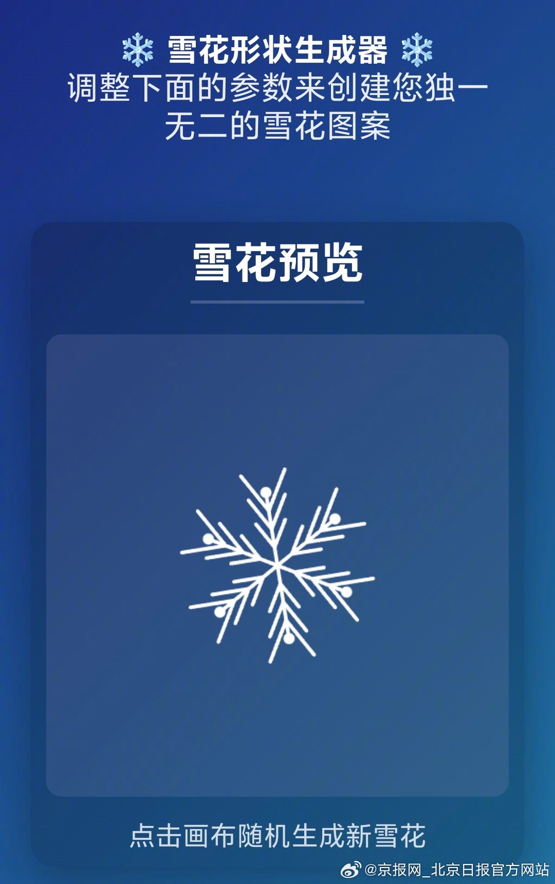 【#大雪节气每个人都有自己的雪花#】#大雪节气你那里下雪了吗#“小雪尽,大雪始。”大雪节气最动人的赠礼,或许就藏在每一片飘落的雪花里。有的如蕨叶,有的似星芒,每一片雪花与世界的触碰,都是一次即兴的、终身的雕塑。在落地的瞬间,便完成了此生唯一的定格。每一片雪,都有着不可复制的轨迹。而你我,亦如此:以独一无二的人生,书写自己的精彩。大雪已至,我们送您独一无二的雪花,致敬独一无二的自己。点击链接:大雪,送您独一无二的雪花,生成独属于自己的雪花图案吧!(实习记者 鲍佳宇)#大雪#