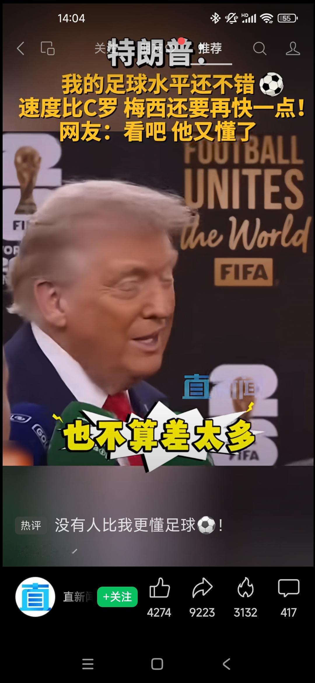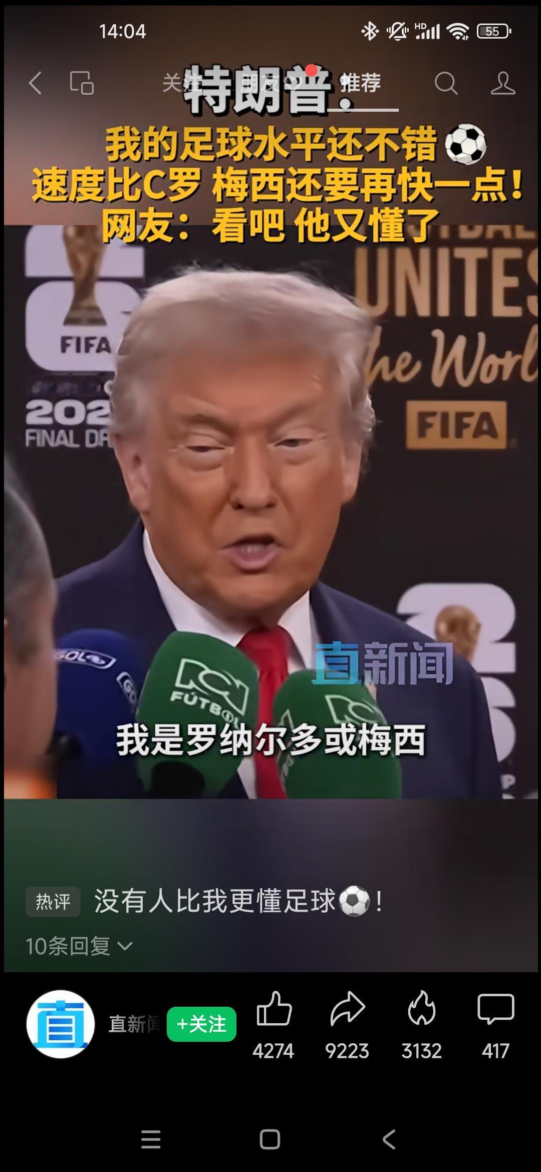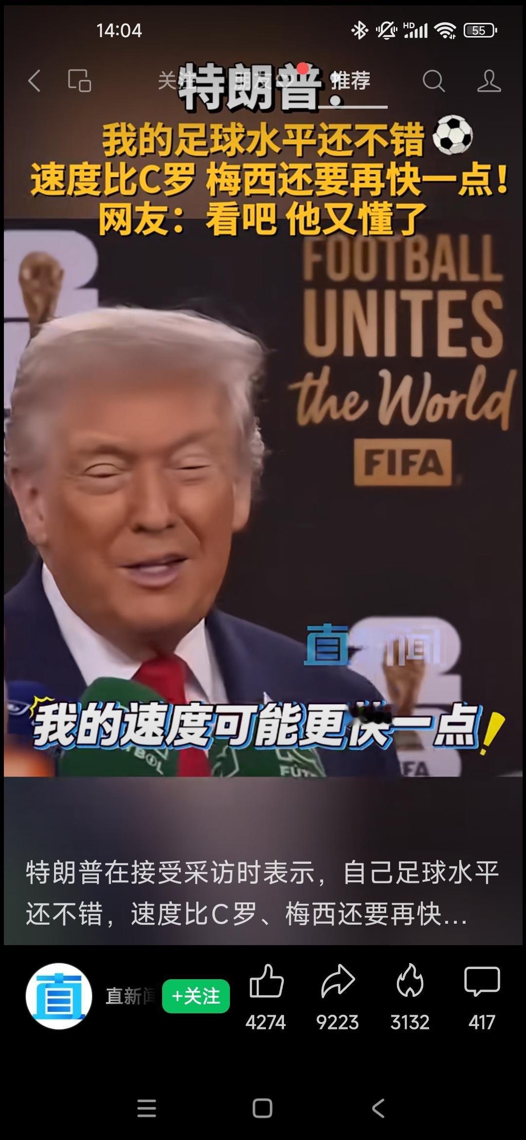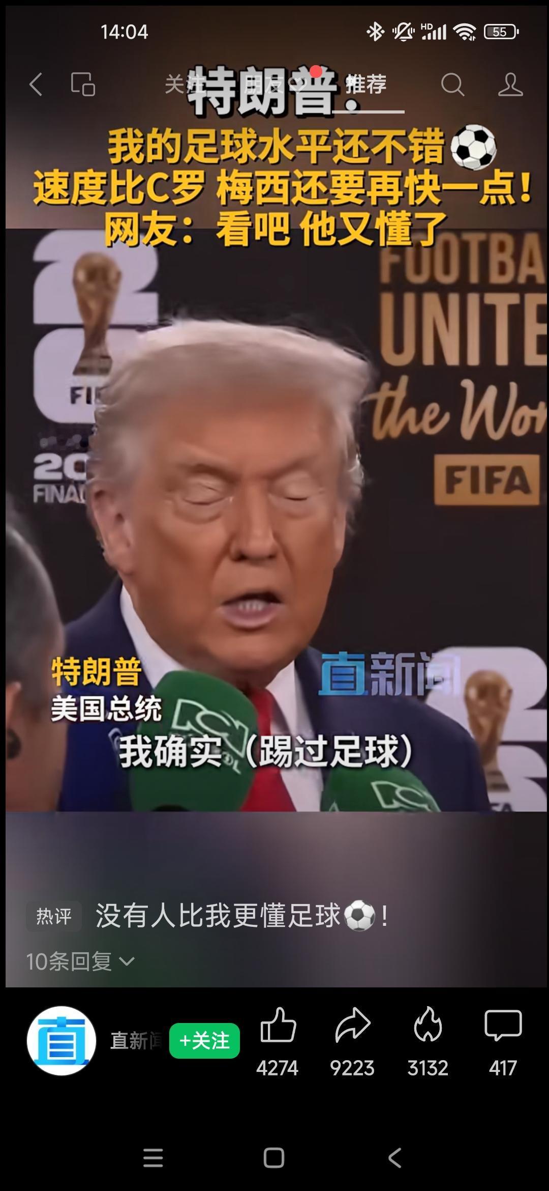 特朗普:我的足球水平和C罗梅西比也没差多少,甚至速度可能更快![大笑]