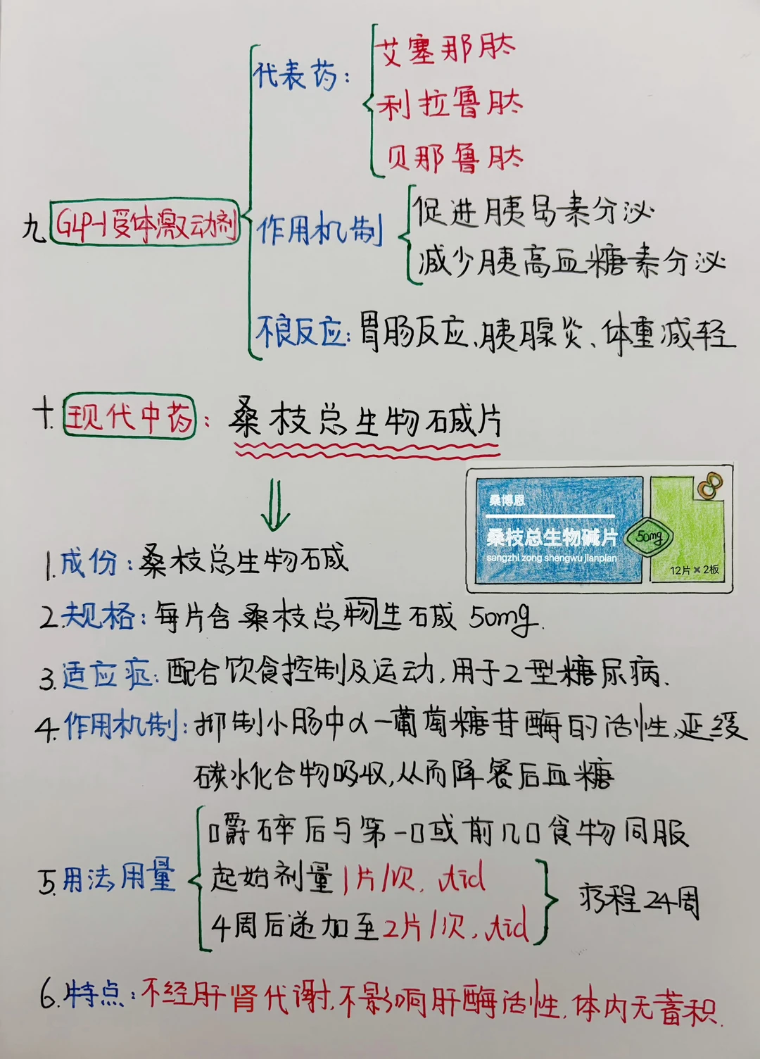 今天给大家分享的糖尿病常用药物相关内容,重点分享一下👉桑枝总生物碱片👈 ⬇️⬇️⬇️ ✅作用机制:抑制小肠中α-葡萄糖苷酶的活性,延缓碳水化合物的吸收,从而降低餐后血糖水平 ✅用法用量:嚼碎后与第一口或前几口食物一起服用。起始剂量每次 1 片,一日 3 次,4 周后递加至每次 2 片,一日 3 次。疗程 24 周。 ✅特点:不经肝脏代谢,不影响肝酶活性,体内无蓄积 希望对大家能有所帮助❤️