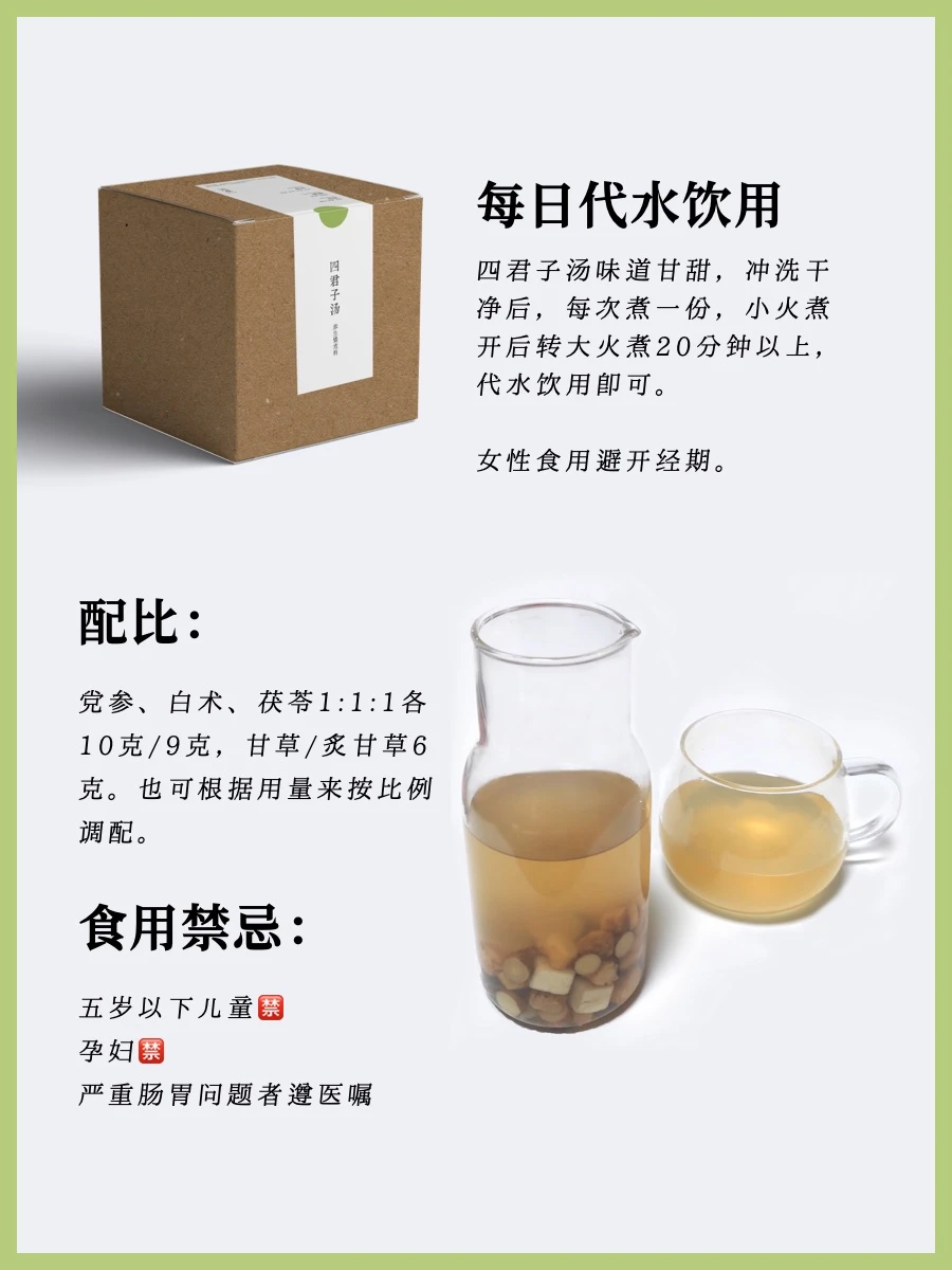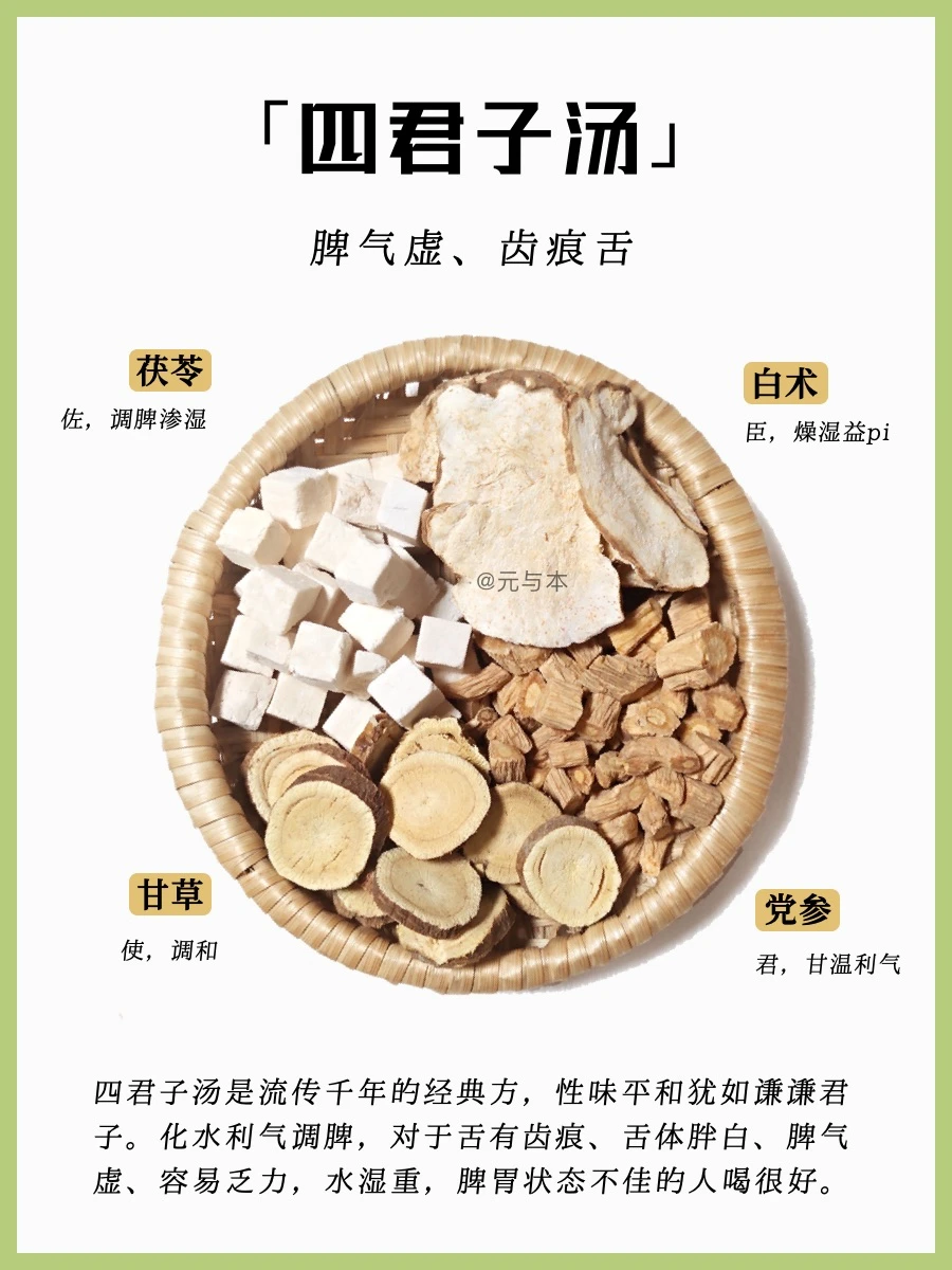 👉🏻脾胃失运,则湿浊内生。 🍃四君子汤药性平和犹如谦谦君子,出自《太平惠民和剂局方》。四君子汤流传千年,性味平和犹如谦谦君子,是脾气虚的经典汤水。如果齿痕重、易出汗、舌头胖,经常乏力、气短懒言的人,很适合喝四君子汤~ 🥣配方:白术10克、茯苓10克、党参10克、甘草/炙甘草6克。 一天一份清水煲煮20-30分钟后代水喝即可。 女性避开月经期,孕妇、5岁以下儿童🈲用。 药食同源 健康科普 四君子汤