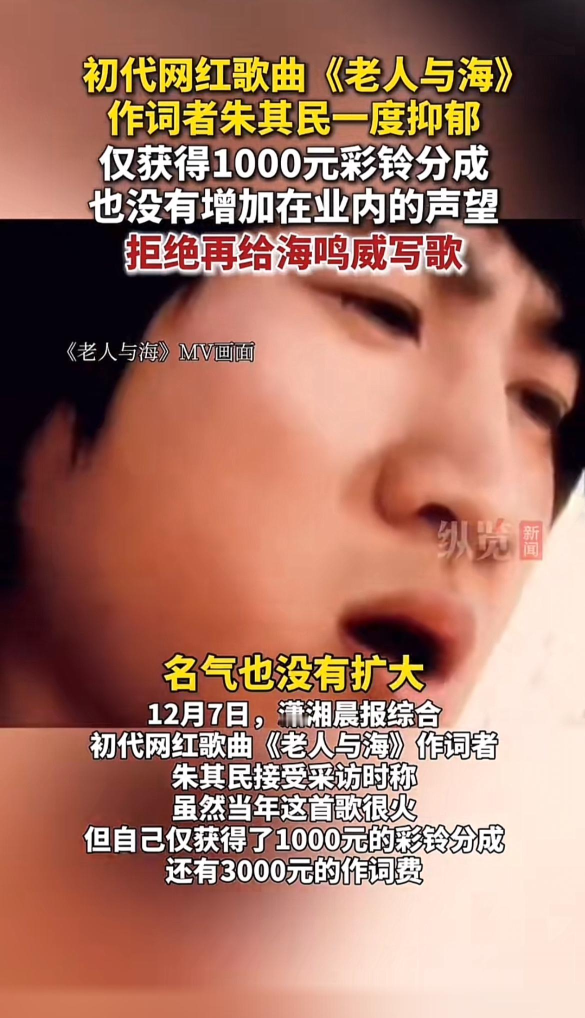 《老人与海》可是经典老歌,很多人听到旋律都能跟着哼唱几句。可谁能想到,它的作词者朱其民只拿了1000元彩铃分成。这1000元在如今看来,对于一首经典歌曲的作词者来说,实在是少得可怜。据说后来他拒绝再给海鸣威写歌,估计也是心里有了落差。一首歌承载着一段回忆,《老人与海》当年火遍大街小巷,可创作者却没得到应有的回报,想想还挺让人唏嘘的。不知道