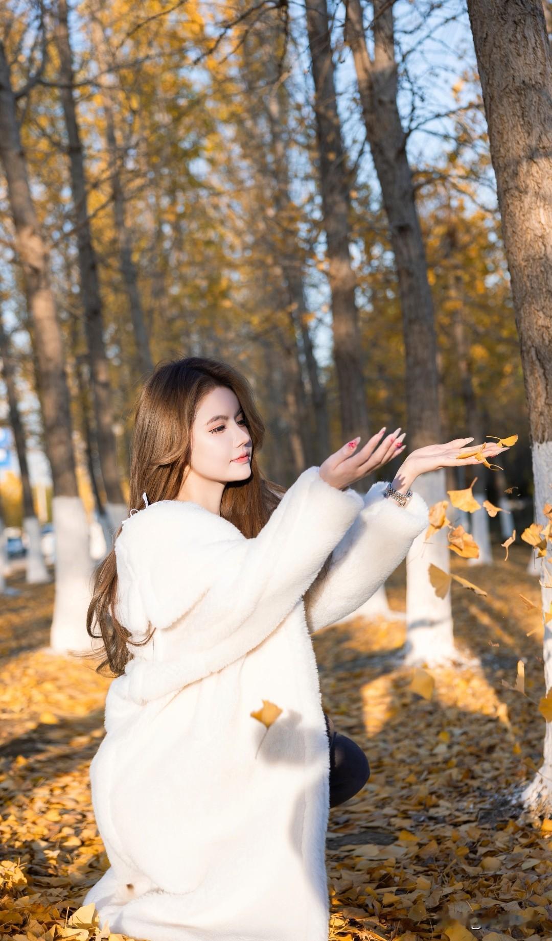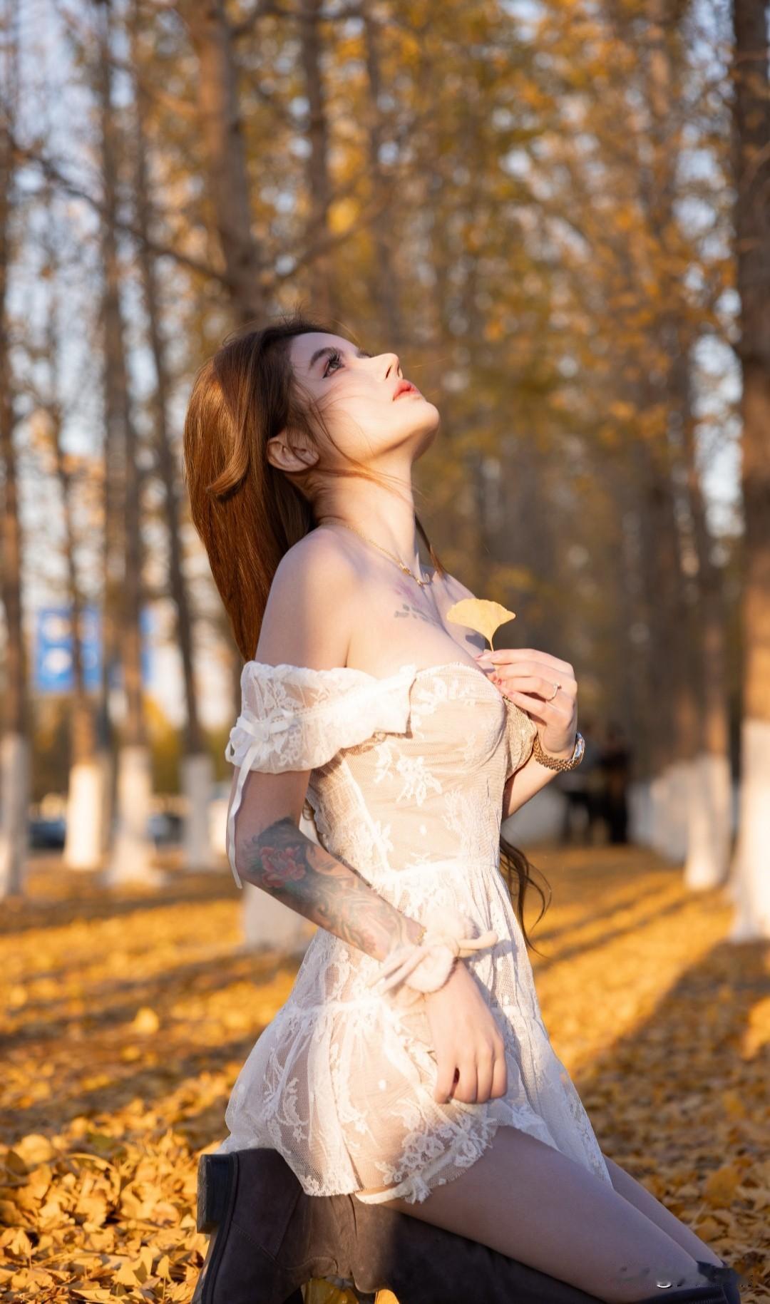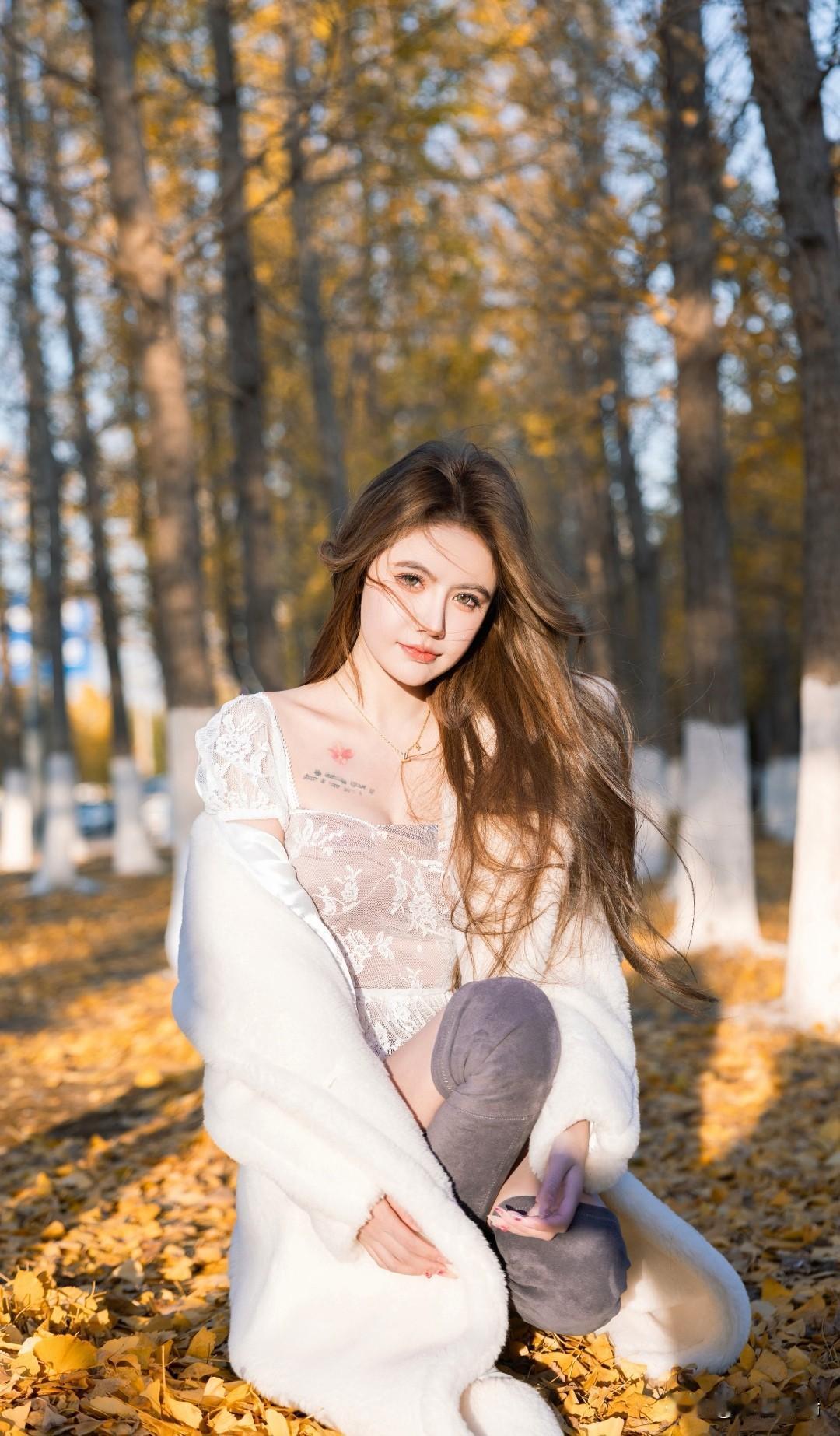 秋日森林中的梦幻少女,柔美的姿态与自然融为一体。