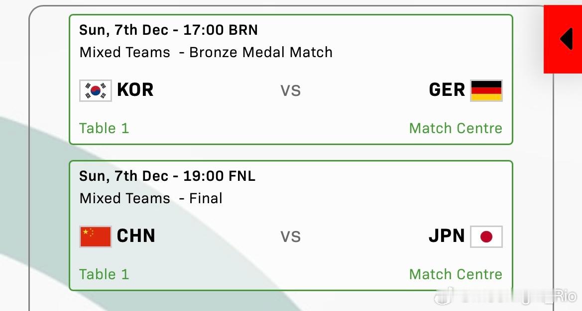 2025成都混合团体世界杯 赛程17:00 · 桌号1 团体 - 铜牌赛🇰🇷韩国🆚德国🇩🇪19:00 · 桌号1 团体 - 决赛 🇨🇳中国🆚日本🇯🇵