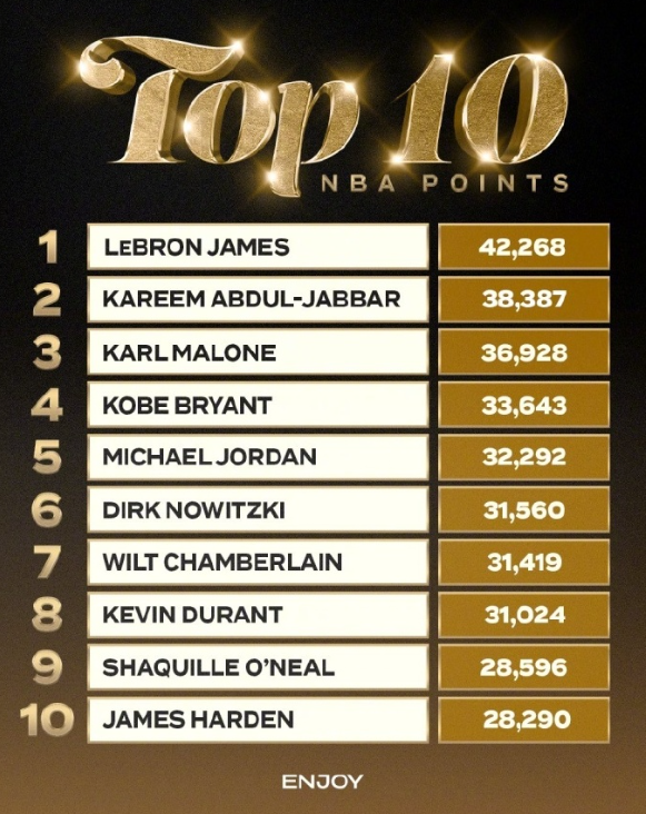 在比赛第三节,哈登两罚全中拿到本场第21分,生涯总得分正式超越了安东尼(28289),跻身NBA历史得分榜第十。