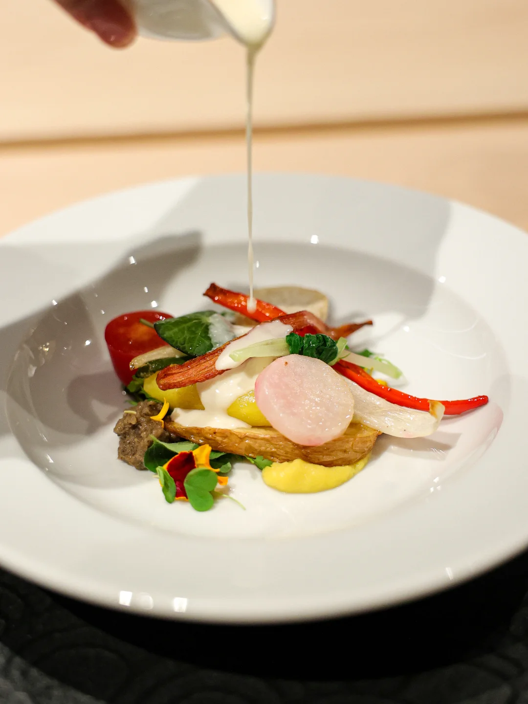 🌟24年在澳门吃完很喜欢的割烹料理餐厅瑞兆,也是顺利拿到了25年的米其林一星。 🇯🇵鸟取县香箱蟹与间人蟹,每一口真是让我感慨在内陆吃到的货确实会稍逊一筹。 🥬京都蔬菜做的拼盘,回归到一种“蔬菜有蔬菜味”的感觉,加上泽西牛芝士酱汁,有滋有味。 🥩三分熟的和牛里脊,搭配黑松露酱与黑糖,使得软嫩的菲力入嘴一口化开的同时,有着霸道的咸香感,真爽。 🐟刺身拼盘 🐟海胆·燕麦奶慕斯及白味增 🐟黑鲍鱼·炭烧昆布 🐟喉黑鱼·晚秋之味觉 🐟甘鲷鱼海鲜炊饭 🍮柿子奶冻