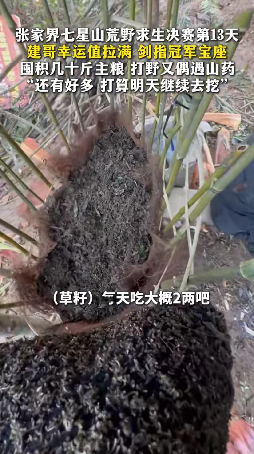 见过把荒野求生玩成“养老局”的吗?张家界七星山的建哥,决赛第13天就实现物资自由,囤几十斤草籽还挖到山药,别人愁下顿他笑说“够吃俩月”,这反差太绝了。 这哪是靠运气?建哥没跟风抢临时食物,反而沉下心攒主粮、找稳定食材。这像极了我们过日子,有人慌着应付眼前,有人早悄悄攒底气,等风浪来的时候才稳得住。 现在太多人陷入“即时焦虑”,工作赶deadline、生活凑活过,忘了提前规划的重要性。建哥在荒野里都懂“囤粮稳心”,我们在日常里更该明白:稳扎稳打的准备,比临时抱佛脚靠谱得多。 不管是荒野生存还是都市打拼,核心都是一样的。提前攒够“粮草”,才有底气把日子过成自己想要的节奏,这种踏实感,比啥都让人安心。