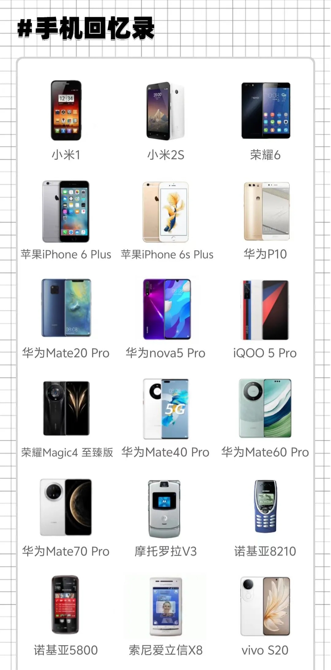 第一部手机,摩托罗拉328C好像是4000多买的, 2,三星A100, 3,诺基亚3210, 4,诺基亚8250, 5,三星什么型号忘记了(CDMA翻盖和旋的), 6,飞利浦9a9, 7,诺基亚N73, 8,诺基亚5230, 9,诺基亚5800, 10,三星滑盖的(型号忘记了), 11,黑莓9800, 12,黑莓Z10, 13,三星什么型号忘记了, 14,小米2S, 15,华为(型号忘记了), 16 , 苹果6, 17, VO, 18,华为MT10, 19,VOx6, 20,VOx7, 21,VOx9, 22,VOx21s, 23,VOx23, 24,VOx27, 25,VOx30, 26,华为P40, 27,VOx80, 28,华为P70