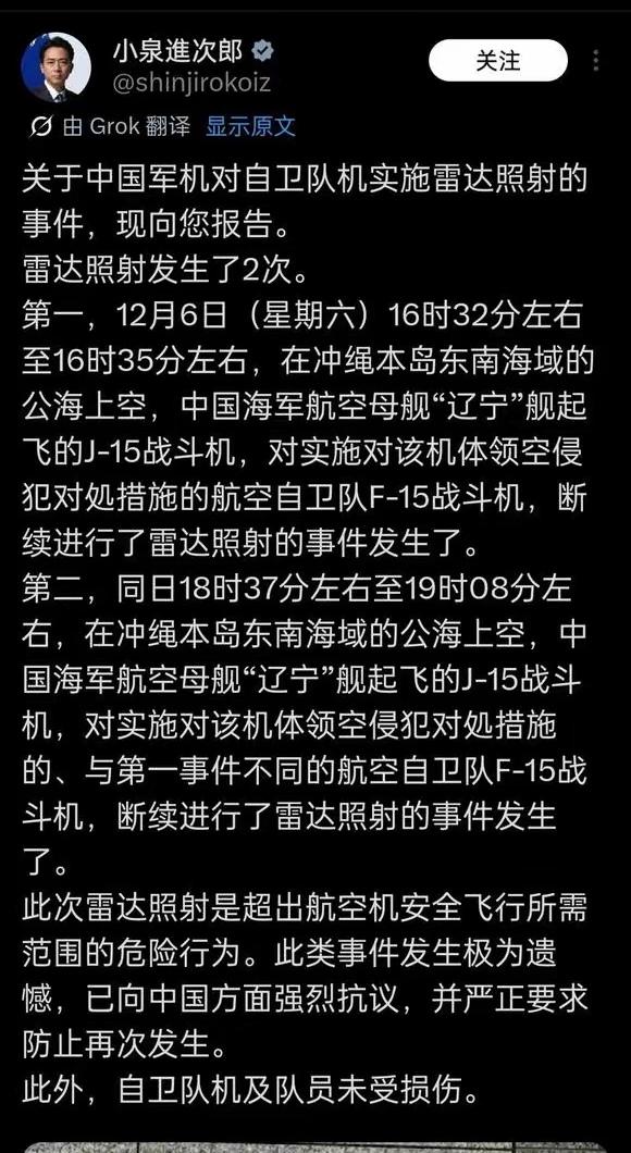 现在咱们这里的飞机这么嚣张吗?在外动不动就用火控雷达照别人吗? 日本的小泉进次郎发文控诉咱们的飞机有对日本飞机进行火控雷达照射,这种情况继续发展下去会不会有事发生呢? 不过发生又能怎么样呢?就喜欢这种照你你还不能发火的囧样。