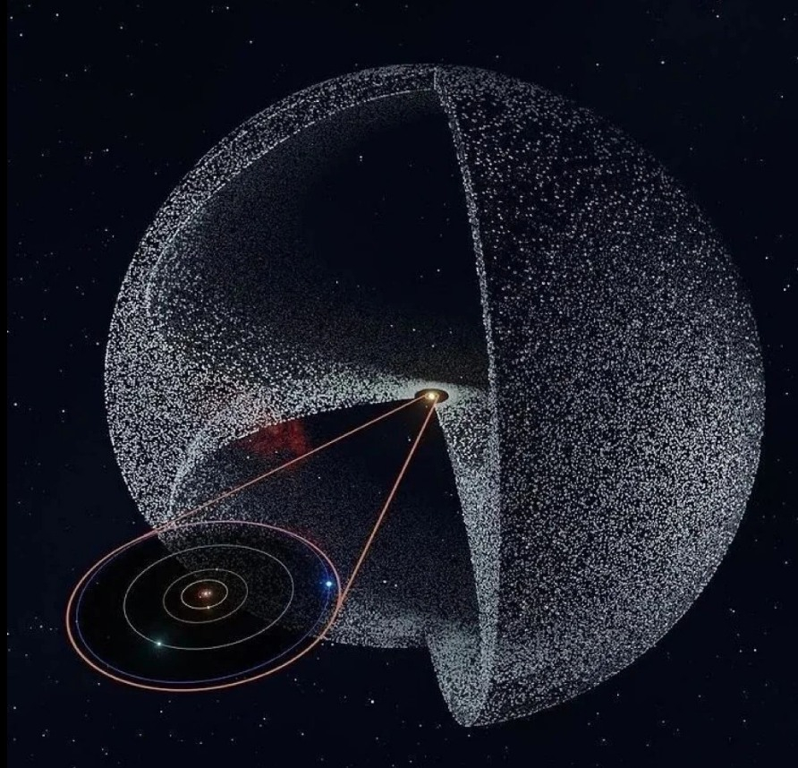 奥尔特云,太阳系真正的尽头奥尔特云(Oort Cloud)是包围著太阳系的球体云团,布满著不少不活跃的彗星,距离太阳约50000~100000个天文单位,最大半径差不多為1光年,即太阳与比邻星距离的四分之一。天文学家普遍认為奥尔特云是50亿年前形成太阳及其行星的星云之残余物质,并包围著太阳系。