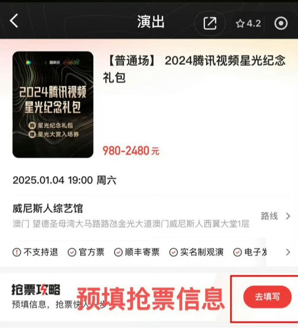 星光大赏购//票流程:(12.21 海口)1️⃣V7/V8和Jump卡用户优先购(去的优先这个)12月8日14:00-20:00,腾讯视频V7/V8和Jump卡用户登记信息获得购买资格(需要实名)12月9日14:00 腾讯视频V7/V8和Jump卡用户抢票2️⃣12月10日14:00 普通用户抢票3️⃣抢票步骤 (以2024为例)1. 登录腾讯视频APP,在星光大赏活动页完成实名登记 2.绑定猫眼小程序,完成地址和信息填写 3.腾讯视频APP→搜索“星光大赏”或跳转猫眼小程序 严浩翔星光大赏