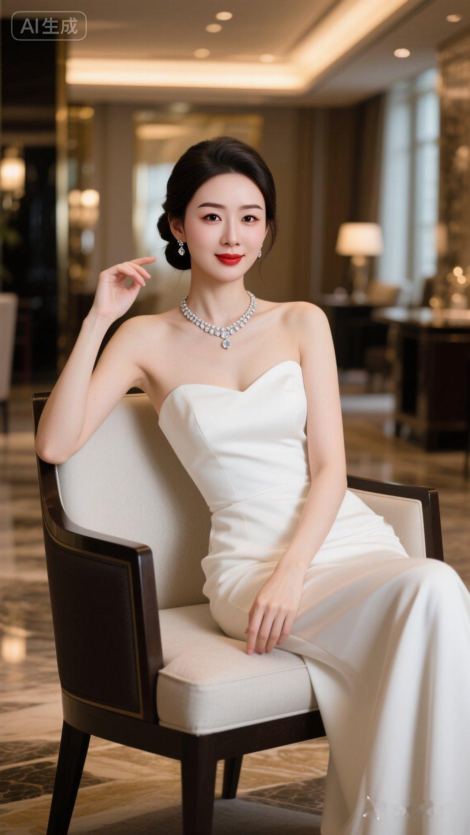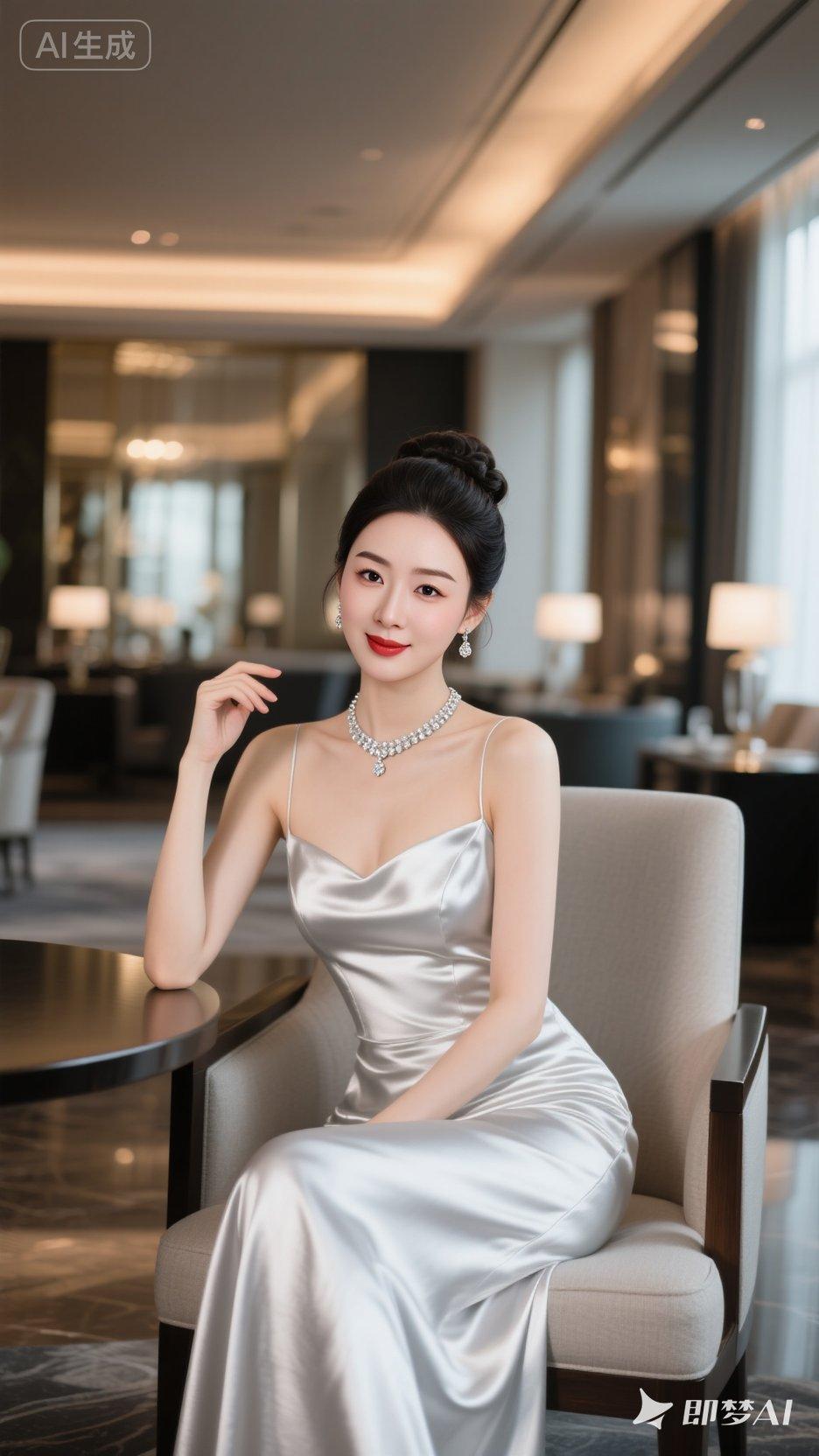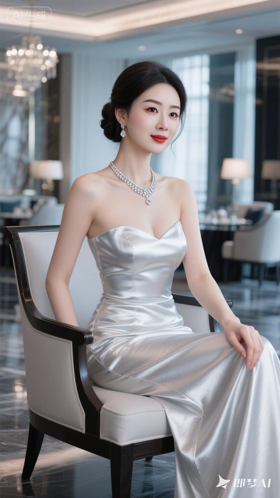 御姐气质,高贵,端庄,秀丽,身穿高档礼服,颜色银色白纱质,环境高端大气上档次,会所大厅,美人坐在大厅的椅子,右手姿势动作唯美,身姿挺拔,头发盘起来,大眼睛,双眼皮,长睫毛,红嘴唇