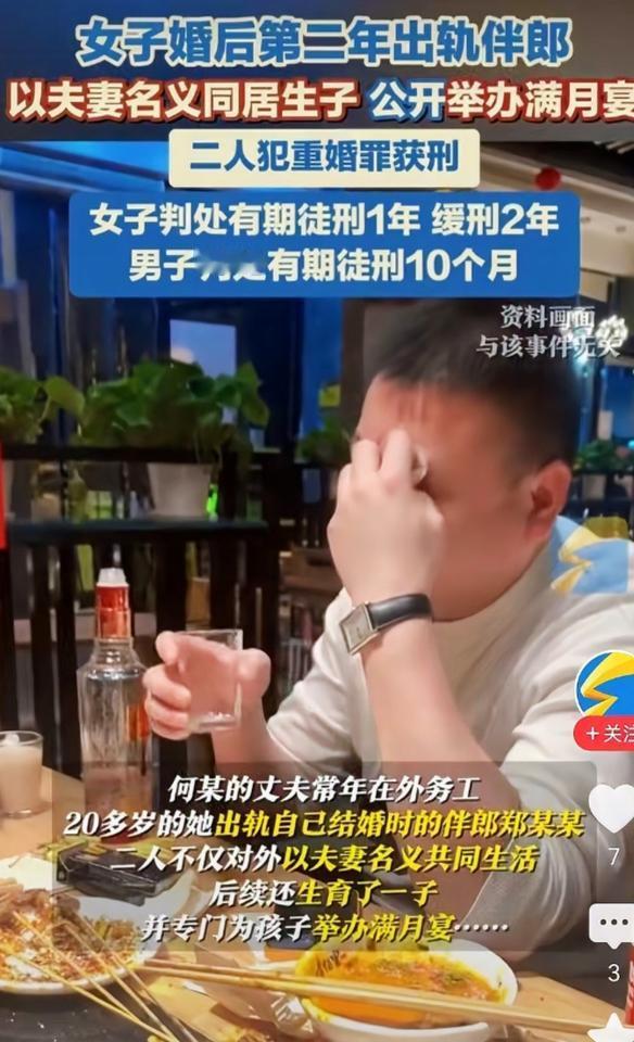 新婚妻子为何会与伴郎以夫妻名义共同生活并诞下私生子?近日一起重婚案件引发关注。 近日,陕西省柞水县发生一起备受瞩目的重婚案件。28岁的何女士在2019年底与程先生登记结婚后不久,便与担任伴郎的郑先生展开不正当关系,并在婚后第二年以夫妻名义共同生活,甚至育有一子。2023年6月26日,二人因涉嫌重婚罪被逮捕。据中国裁判文书网报道,法院认定何女士与郑先生的行为构成重婚罪,最终判处何女士有期徒刑一年,缓刑两年;郑先生有期徒刑十个月。这起案件不仅揭示了婚姻中的道德底线,也引发了公众对婚外情及法律后果的关注。