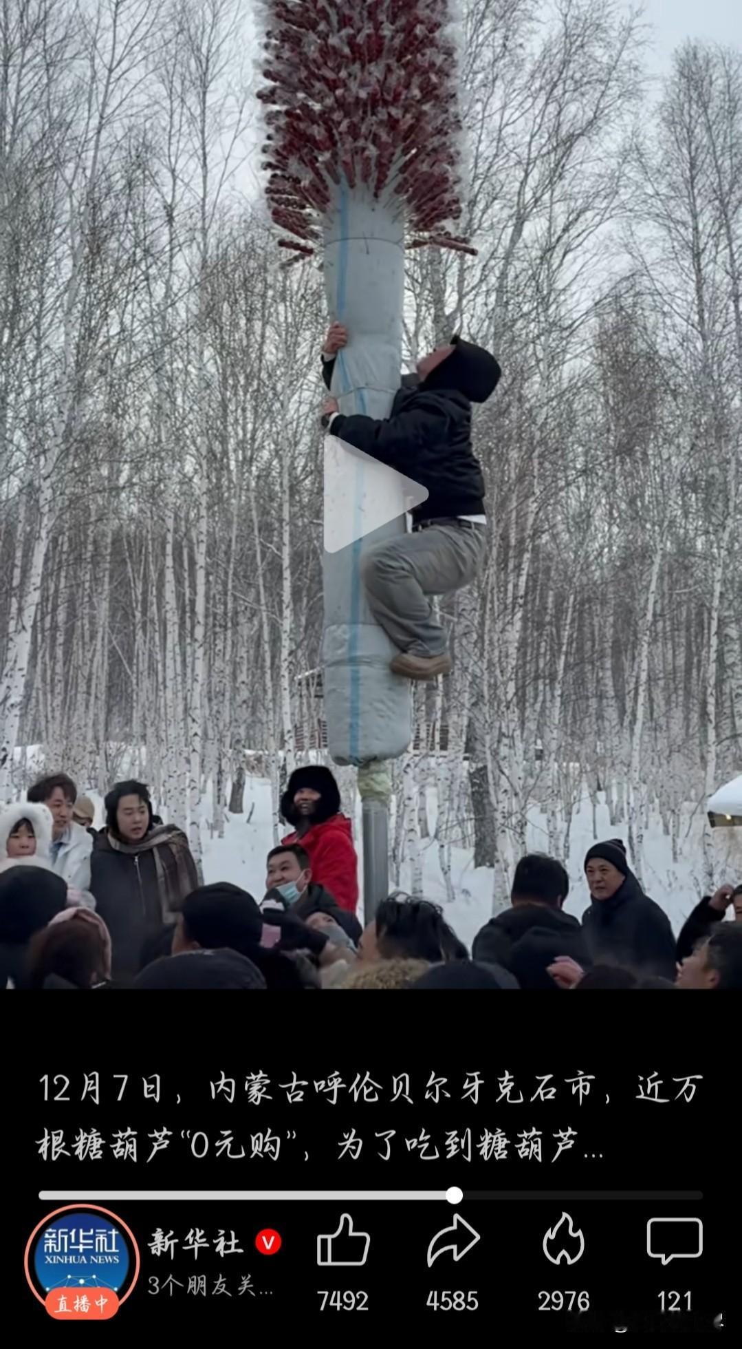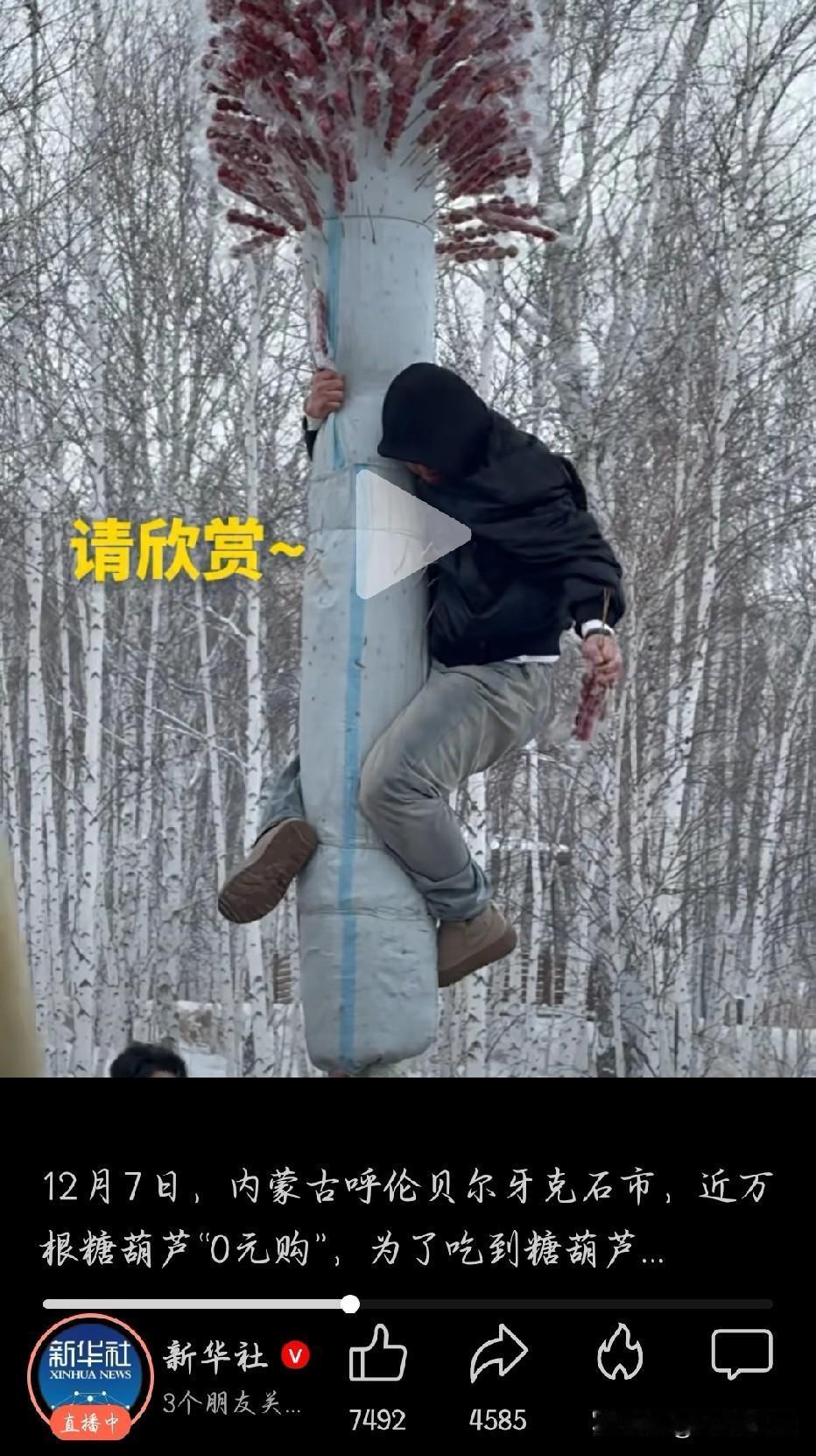“拿完你的拿你的!”12月7日,内蒙古呼伦贝尔市,近万根糖葫芦“0”元购,为了吃到糖葫芦,大家也是各显神通! 12月7日的内蒙古呼伦贝尔牙克石市,一场“甜蜜狂欢”彻底点燃了冬日的寒冷,近万根冰糖葫芦变身“0元购”福利,让现场游客们瞬间开启“各显神通”模式,热闹场面刷爆了社交平台。 这场欢乐的源头,是凤凰山冰糖葫芦冰雪艺术季上亮相的5棵巨型“糖葫芦树”。最高的一棵足足有11米,差不多相当于三层楼的高度,其余4棵也有6米高,远远望去,红彤彤的山楂裹着晶莹剔透的糖衣,密密麻麻插在特制的“树干”上,在冬日阳光下闪着诱人的光泽,活脱脱一片甜蜜的“糖葫芦森林”。 这些糖葫芦都是活动方现做现插的,新鲜的山楂果肉饱满,熬制的糖浆火候恰到好处,咬下去的脆响隔着老远都能让人脑补出那酸甜交织的口感。 活动一开始,现场就瞬间沸腾起来。原本还算宽敞的场地,很快被闻讯而来的游客挤得水泄不通,大家摩肩接踵,眼里都盯着那些挂在“树”上的甜蜜诱惑。 为了吃到免费糖葫芦,游客们可谓是花样百出:个子高的直接踮起脚尖,伸手就能够到下层的糖葫芦,脸上满是轻松惬意;个子稍矮的则找来了长木棍,小心翼翼地挑动上层的串儿,瞄准目标后轻轻一拉,糖葫芦就稳稳落在手里; 还有的游客干脆两两配合,一人弯腰当“人梯”,一人站在肩头,伸手去够最高处的“甜蜜顶点”,引得周围人阵阵欢呼。更有细心的游客提前备好了小袋子,摘到几串就小心翼翼地装好,说是要带给还没赶来的家人尝尝鲜。 现场的氛围热烈又欢乐,大家忙着摘糖葫芦的同时,还不忘互相打趣。有人刚摘到一串就迫不及待地咬上一口,糖衣的酥脆和山楂的酸甜在嘴里化开,冻得通红的脸上立刻露出满足的笑容; 还有人不小心把糖衣蹭到了脸上,变成了可爱的“小花猫”,自己却浑然不觉,引得旁人哈哈大笑。 活动方也十分贴心,特意准备了不少备用的长杆子,供游客们轮流使用,还安排了工作人员在现场维持秩序,确保大家能安全又开心地享受这份福利。 其实这样的“免费美食狂欢”并非个例,最近安徽宁国的商户们就自发组织起来,在“皖南川藏线”入口免费给游客投喂羊汤、炒面、橘子和当地特色粑粑,用最朴实的方式为家乡吸引游客; 南宁蒲庙的花婆节上,免费派送的花婆粥也让数万人感受到了民俗活动的温暖。而呼伦贝尔这场糖葫芦“0元购”,更是把传统小吃和冰雪旅游巧妙结合,用创意满满的方式为冬日旅游增添了亮点。 据悉,牙克石市近年来一直通过举办冰雪艺术节带动当地旅游发展,去年类似的特色活动就吸引了超10万游客前来打卡。 今年这5棵巨型糖葫芦树,不仅是视觉上的惊喜,更让游客们在体验冰雪乐趣的同时,收获了实实在在的甜蜜。 阳光洒在洁白的雪地上,映着人们脸上的笑容和手里红彤彤的糖葫芦,构成了一幅冬日里最温暖热闹的画面。 对此,你们有什么看法,欢迎评论留言~