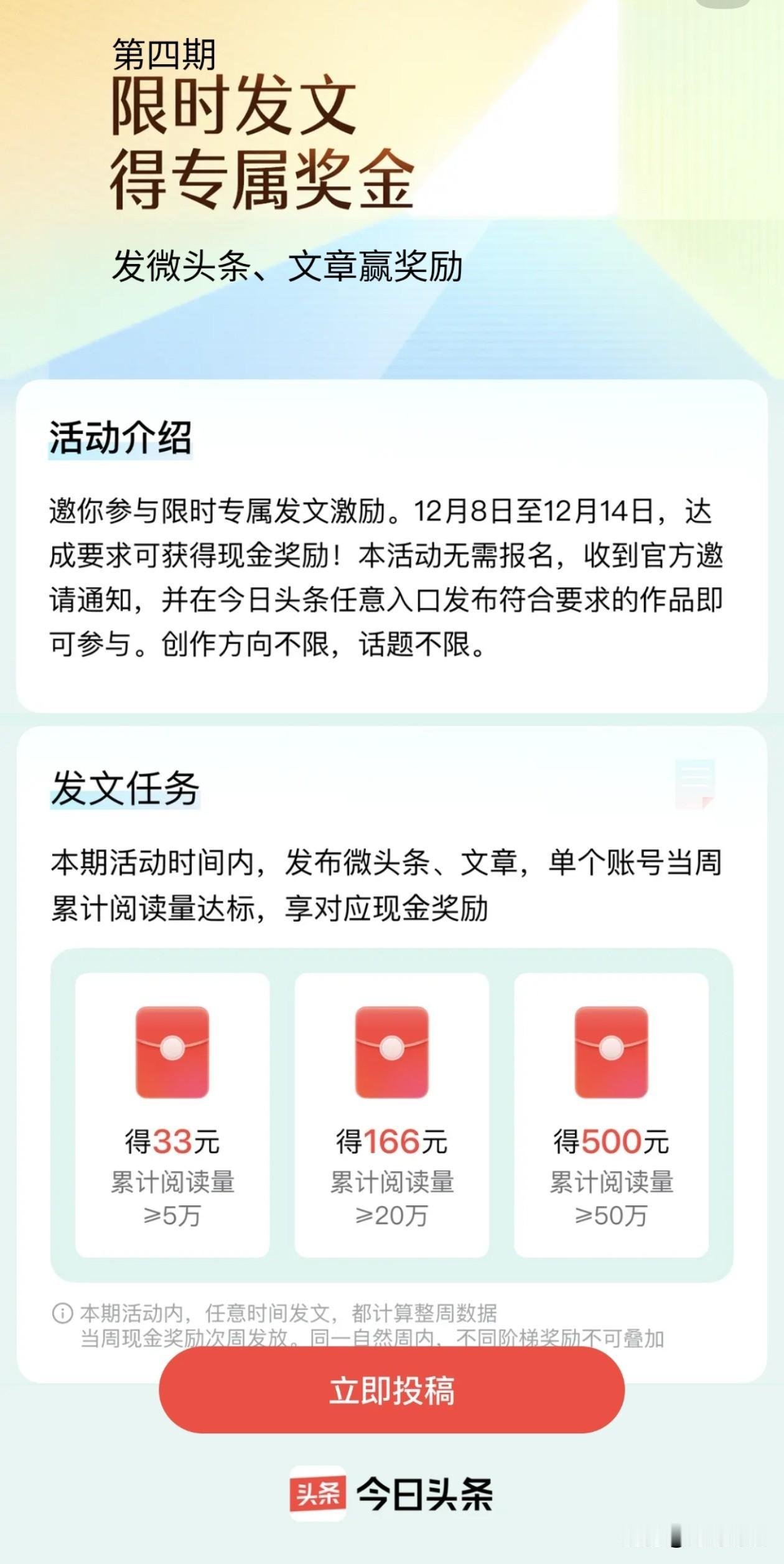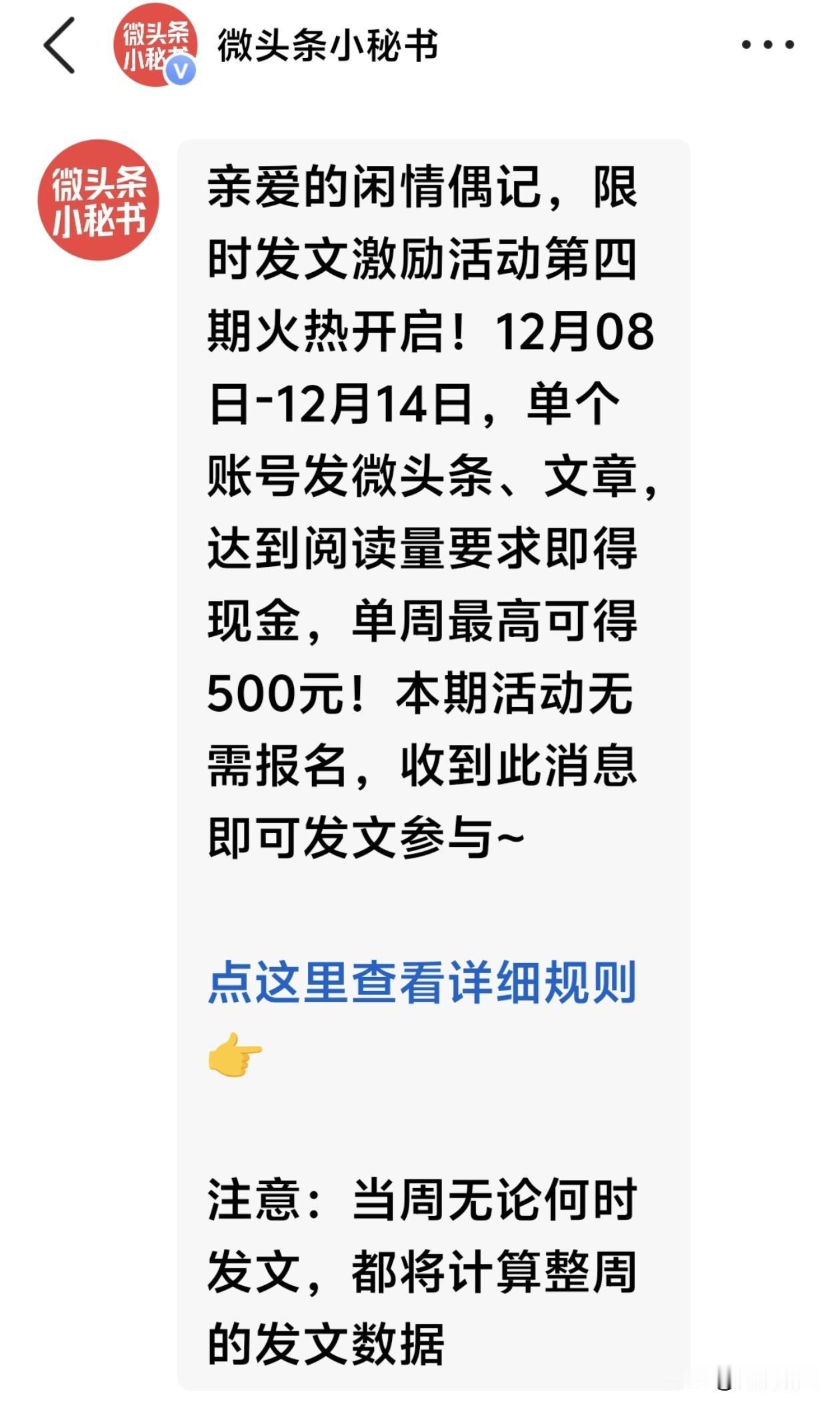 第四期创作激励来啦!还有我的“冲奖”小秘诀 微头条小秘书发消息给我了,点开一看——“亲爱的闲情偶记,限时发文激励活动第四期火热开启啦”!瞬间眼睛都亮了, 这周只要发微头条或者文章,阅读量达标就能拿现金,最高500块呢! 而且不用报名,收到通知直接发就行,创作方向和话题全放开,这机会可不能错过! 看到那三个红包档位,我心里立马开始盘算:5万阅读33元,20万166元,50万500元。结合上周的数据,我的阅读量干到了55万,还拿了1300加油包!这周照着上周的劲儿继续冲, 听说这周平台还有流量扶持,说不定还能出爆款,越想越激动,手都已经快摸到奖金的边儿了! 不过光靠多发还不够,我最近总结了几个小技巧,分享给友友们,一起冲一冲! 1️⃣ 选对发布时间,抓住流量高峰 我试过早上7-8点、中午12点和晚上8-10点发,发现晚上的阅读量明 显更高。大家睡前刷手机的时间多,这时候发,曝光机会更大! 2️⃣ 标题加数字,吸引眼球 比如“5个生活小妙招”“3个赚钱小技巧”,数字一加,读者一眼就能看懂内容重点,点击率会高很多。我上次用“女人不想显老?这8个小习惯要坚持”,阅读量直接破了4万! 3️⃣ 配图要清晰,最好发3张 微头条带图更受欢迎,尤其是清晰、明亮的图片。我决定以后每次发都选3张图,比如分享美食就拍步骤图,分享日常就挑有故事感的照片,阅读量能提升不少。 4️⃣ 结尾带话题标签,增加曝光 比如生活小妙招、我的日常,这样作品会被更多人看到。我还发现带热门话题的标签,比如今日话题,流量会更高哦! 5️⃣ 互动不能少,回复评论涨流量 发完作品后,我都会及时回复评论,哪怕是一句“谢谢”或者“你也有同感呀”,平台会判定内容有互动,推荐量就会增加。有时候读者留言想看续集,立马写个微头条回应,流量能翻倍! 6️⃣ 多参考爆款,模仿加创新 我每天都会刷微头条,看到阅读量高的作品就点进去看标题、内容和配图。比如有个友友发“职场潜规则”,阅读量2万,我就模仿着写“拖垮你职业生涯的10个隐形“坑”,别等被裁员了才看懂”,阅读量也不错。模仿不是照搬,加点自己的特色,效果更好! 现在就盼着赶紧发作品,一边写一边刷刷数据,要是还能像上周冲到50万阅读,那可真是太幸运了! 友友们,你们收到通知没?有没有啥拿手的选题或者运营小技巧,快给我分享点,咱们一起加油,争取这周都把奖金拿到手!
