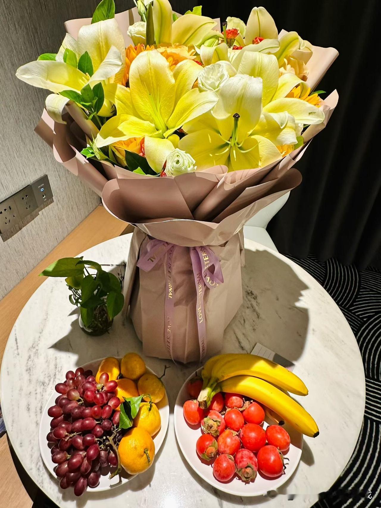 一推开房门,被女儿的心意暖到鼻尖发酸 和女儿分开快俩月,落地直奔她给订的房间——推开门就愣了:一大捧黄百合裹着温柔的浅棕包装,香得漫了满室;桌上摆着我爱吃的红提、橘子,连小番茄都带着蒂,香蕉也挑了最饱满的串。 她知道我贪花香又嘴馋,连细节都捏得死死的。暖光灯裹着花束的软光,水果盘边的绿萝晃着叶子,明明是陌生的房间,偏被她填得全是家的温度。 原来孩子的“精心准备”,从不是多贵的东西,是把你喜欢的一切,都悄悄攒成了见面礼啊。