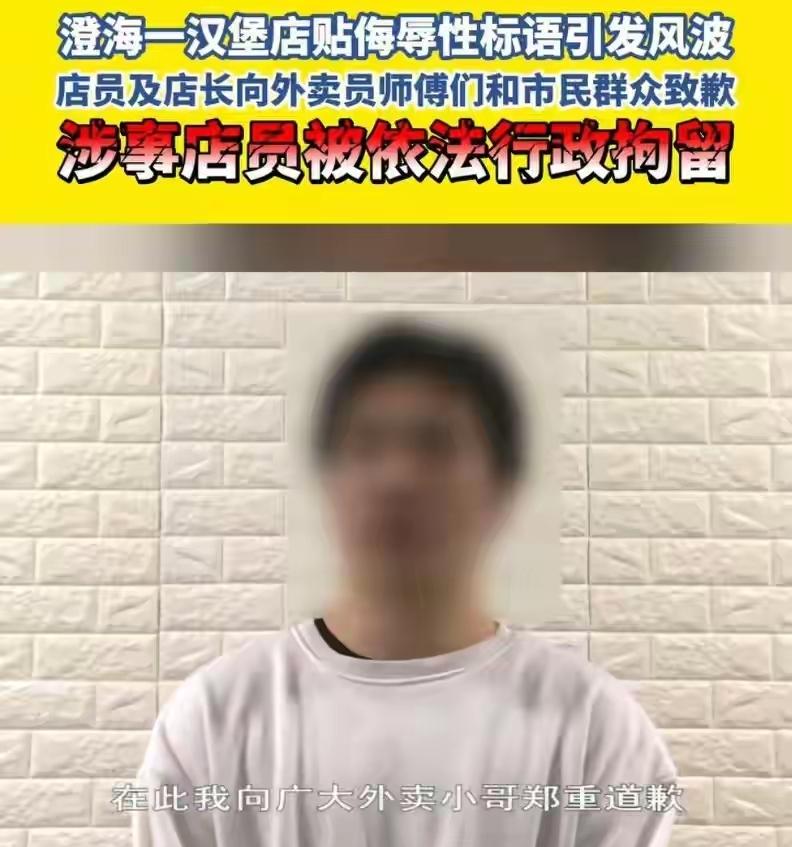 “外卖员与狗禁止入内”后续,涉事员工被拘,市监部门介入,店铺停业招牌被摘。 12月5日,广东汕头澄海一家汉堡店门外被外卖员围起来了,外卖员称讨要一个说法。 原来这家店铺门口张贴了一张“禁止犬吠,外卖重地,外卖员与狗勿进”,这谁看了不得急眼,这不是侮辱人吗? 看到这张贴纸的外卖员发到了外卖群里,引起了轰动,把店铺围的里三圈外三圈。据悉,店铺员工张贴这个是因为有外卖员等不及到厨房崔餐,引起了店员的不满所以自己写了字张贴在门口。 工作不分高低贵贱,都是靠自己双手吃饭,这样拿外卖员和狗做对比,好比小日子辱华一样,没打他就不错了。 事情曝光后涉事店员被刑拘,店铺呢也被市监局检查。这家汉堡店就是个外卖店,不做堂食,食品许可证也已过期三个月,不得不停业整顿,那个店员也录了视频做了道歉。 现在最恨他的不是外卖员,应该是店老板吧,要不是这个员工的没头脑,店铺也不至于摘了招牌干不下去了。 外卖员凭自己本事吃饭,时不时的还做点好事,他们要的不是荣誉,而是真正的尊重。
