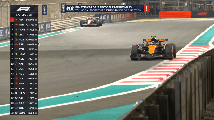 角田裕毅因二次变线被罚5秒,诺里斯离开赛道获利不会有进一步调查;